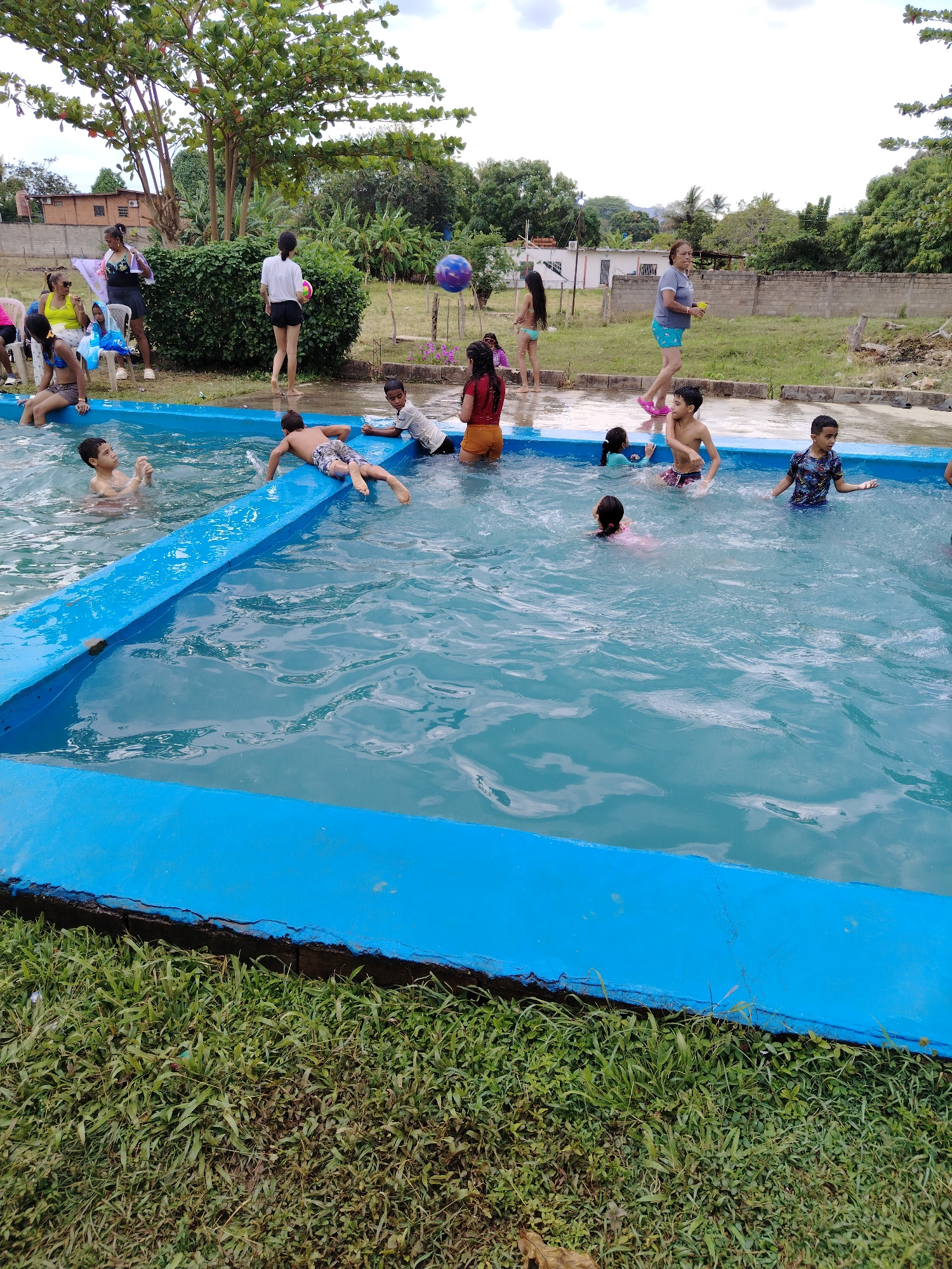 A group of children are playing in a rectangular, blue-rimmed swimming pool. Some are swimming, others are sitting or lying on the edge of the pool. Several adults are standing or sitting nearby. The…read more