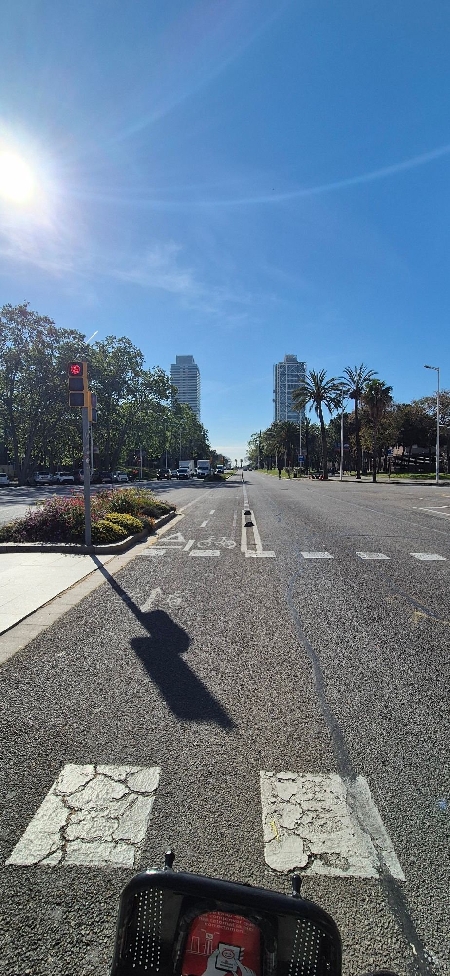 The image presents a sun-drenched street scene in Barcelona, captured from a low perspective, possibly from a bicycle or scooter. The wide asphalt road, adorned with white lane markings and bicycle sy…read more