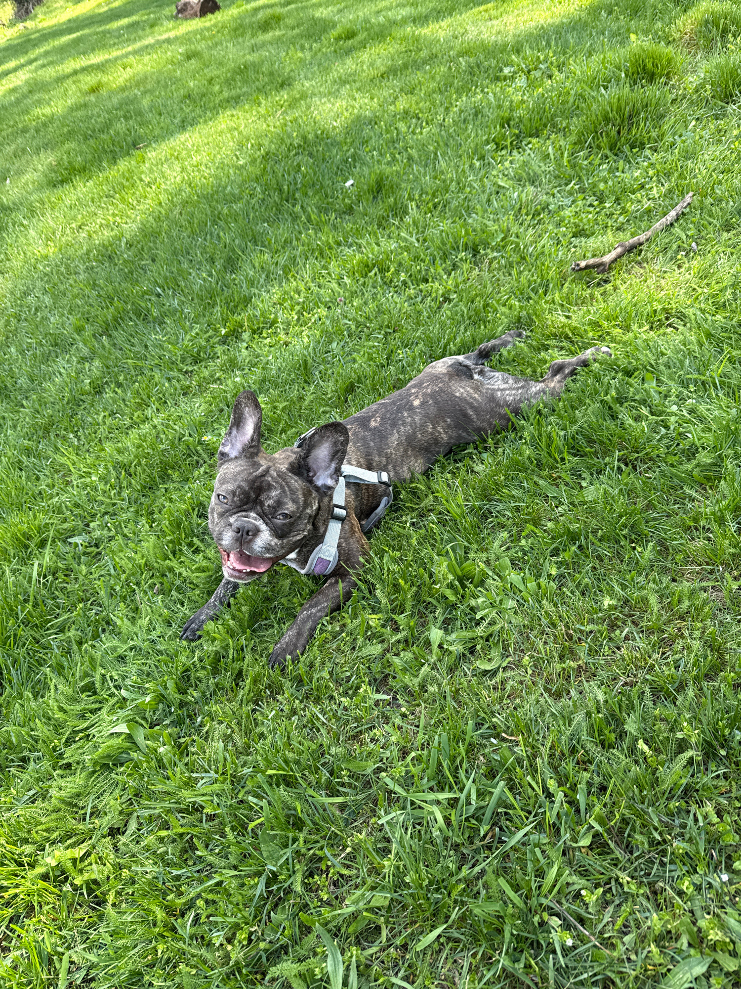 A brindle-colored dog is lying on its back in a grassy area. The dog wears a grey harness and its mouth is open. A small stick is visible in its mouth. The grass is green and lush, and a larger stick…read more