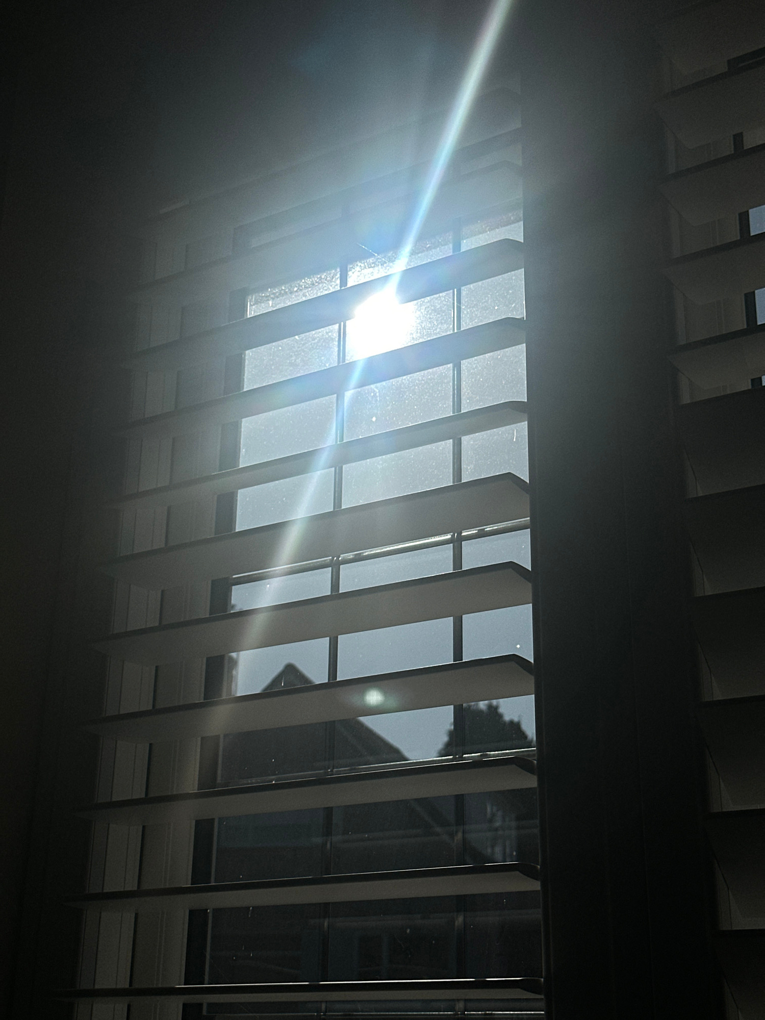 An indoor photograph from Wealden, United Kingdom, shows a window fitted with light-colored horizontal slatted blinds, viewed from an interior perspective. Intense sunlight penetrates the window, crea…read more