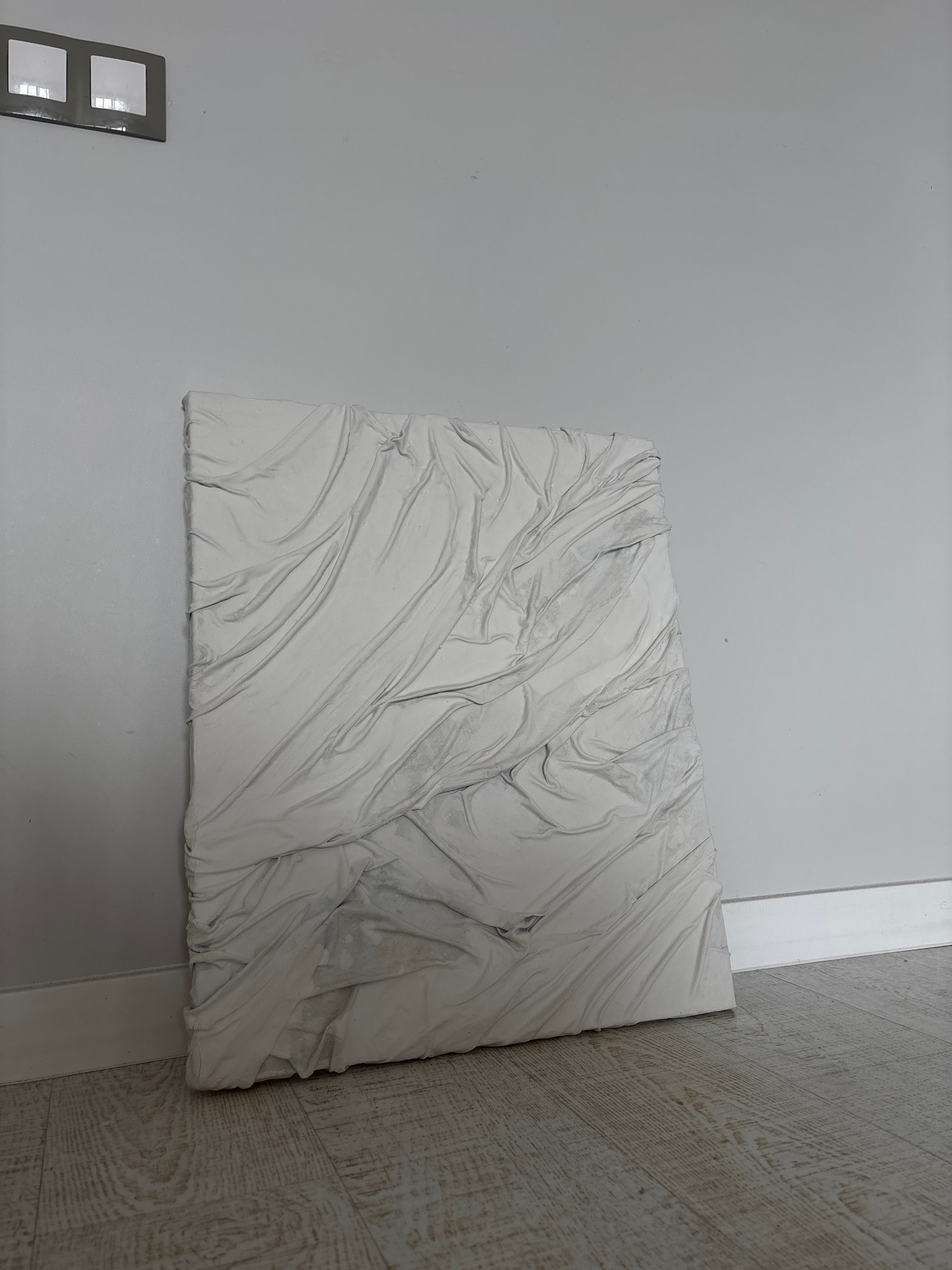 This media file presents an interior scene featuring a prominent, textured, rectangular object. The object, appearing to be a relief sculpture or a heavily textured canvas, is light grey to off-white…read more