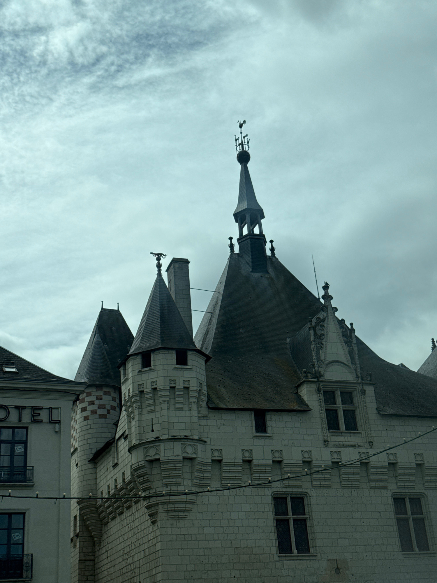 The image shows a low-angle view of a building with multiple towers and spires, likely a castle or historical structure. The architecture is ornate, featuring detailed stonework, arched windows, and d…read more