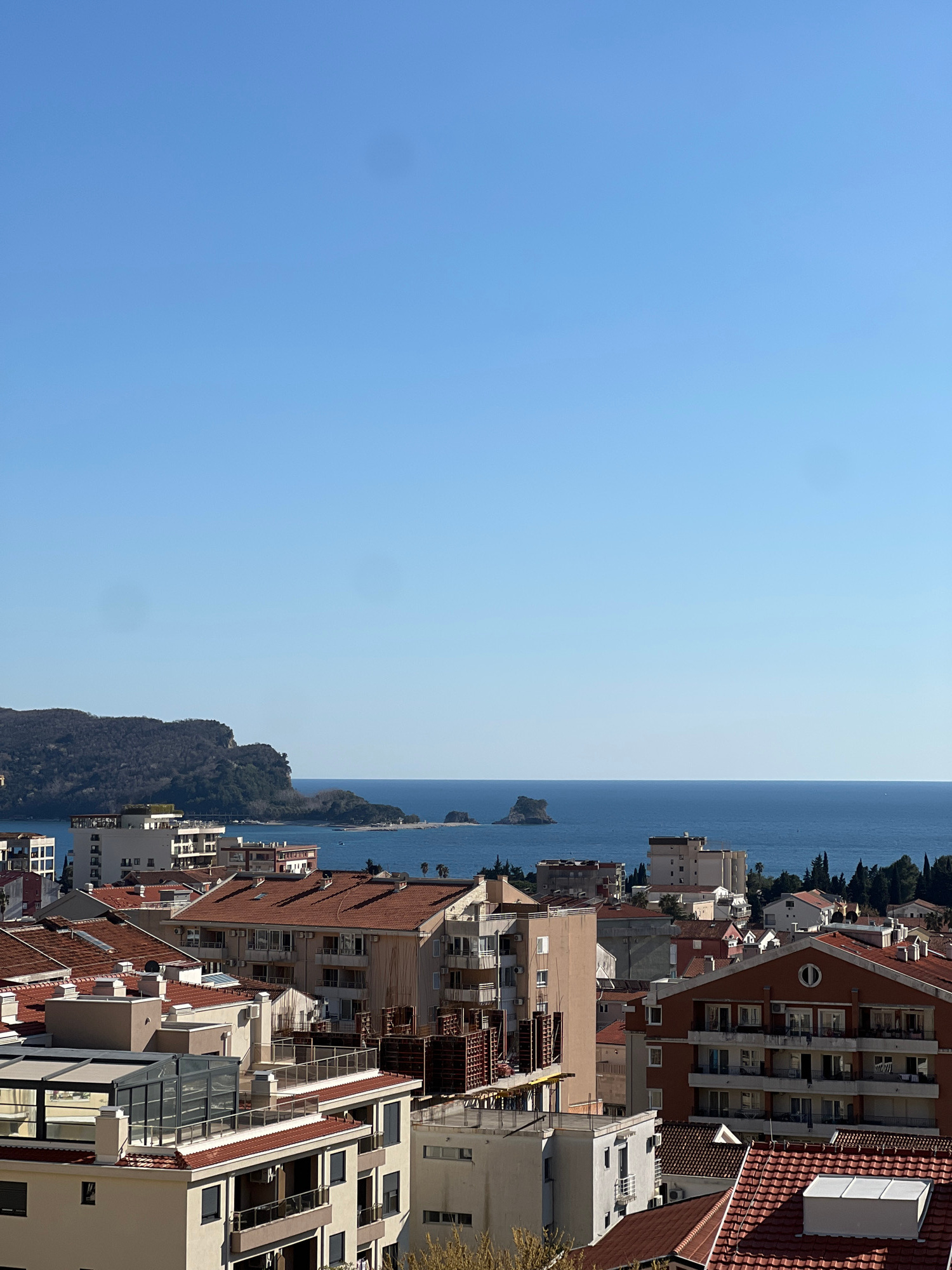 The image shows an aerial view of the city of Budva, Montenegro, with a clear blue sky and the Adriatic Sea in the background. Buildings with red tiled roofs and white walls are prominent, along withβ¦read more