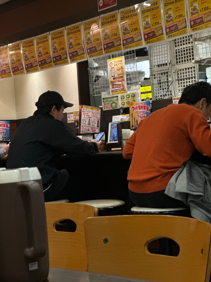 Two people are seated at a counter in a restaurant. The person closer to the camera is wearing a black jacket and a baseball cap and is looking at a phone. Behind the person, another individual is wea…read more