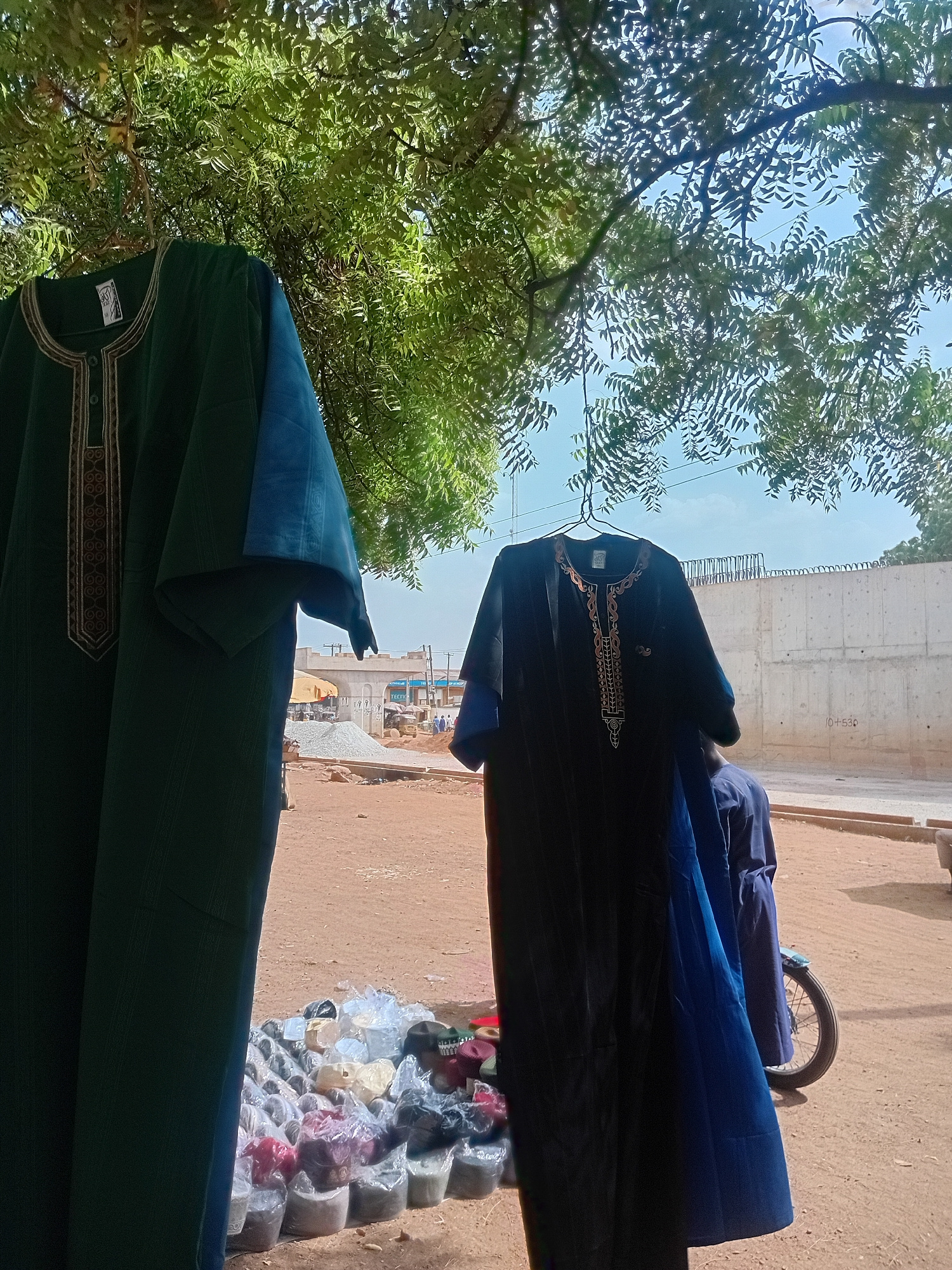 An outdoor market or street vending scene is captured under a bright, sunny sky in what appears to be Minna, Nigeria. The image is taken during the day, with clear blue skies visible through the dense…read more