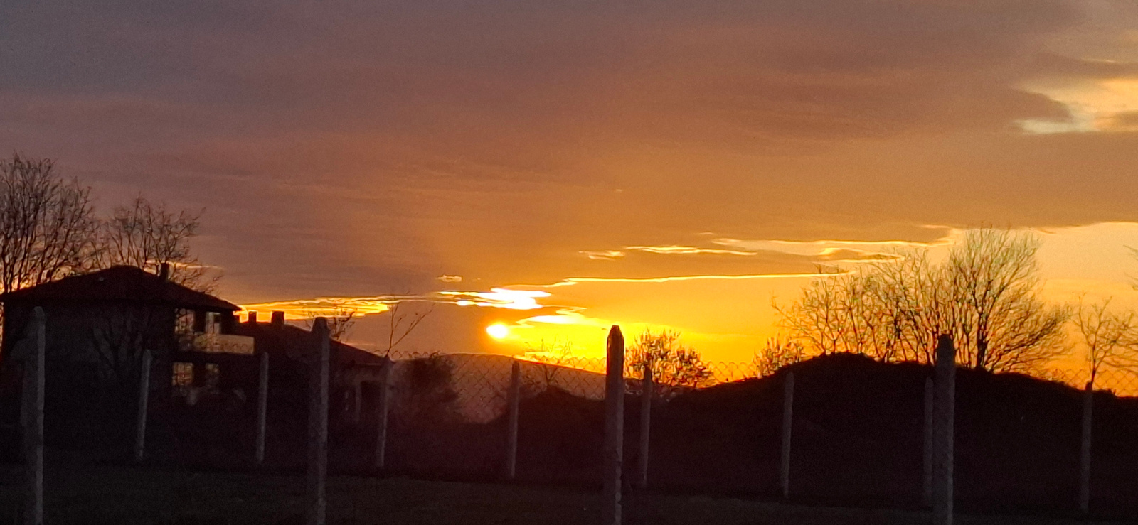 The image depicts a sunset scene in Unknown, Unknown, with a building silhouetted on the left side of the frame. The sky is dominated by shades of orange and yellow, indicating the setting sun. Bare t…read more
