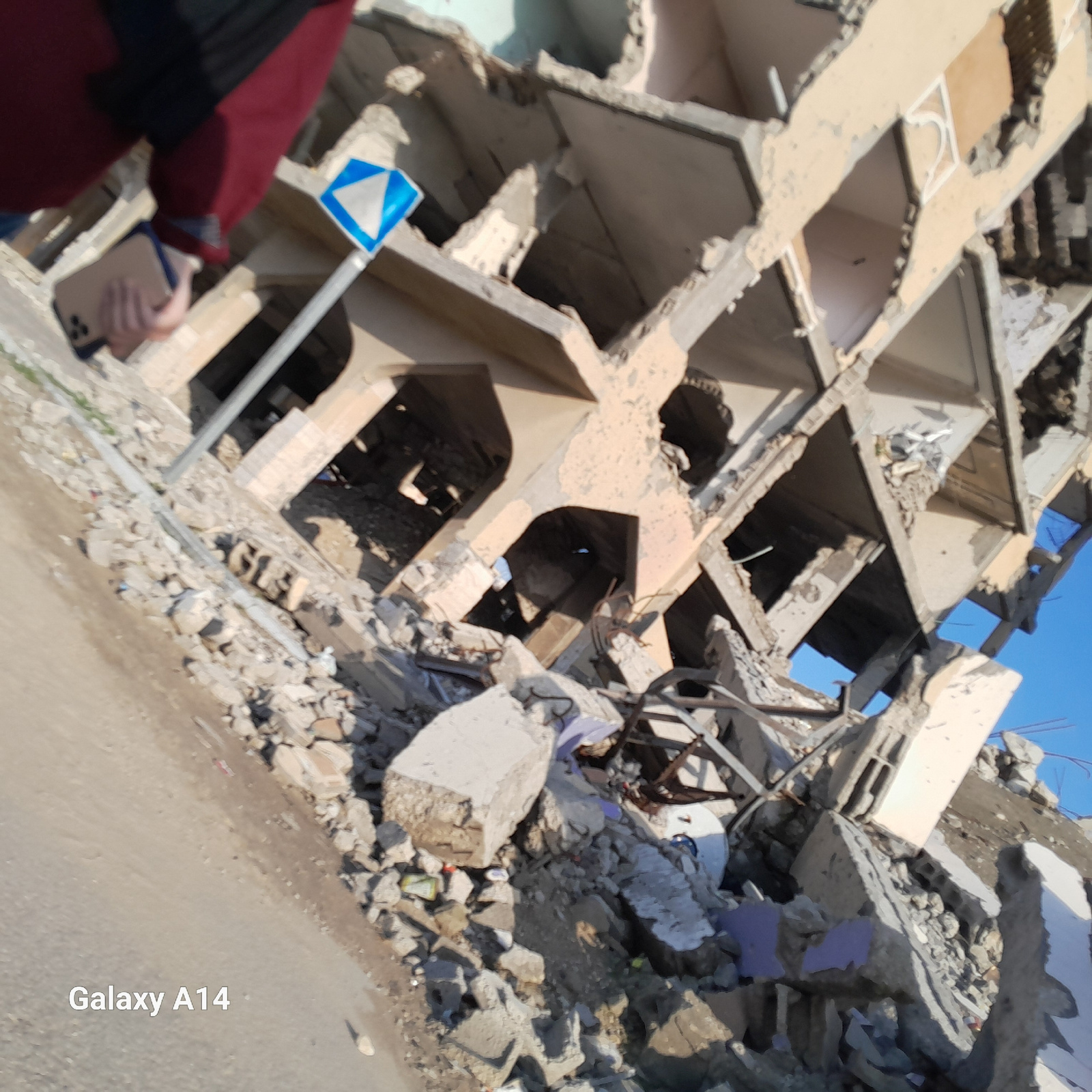 The image depicts a scene of extensive structural damage in Khan Yunis, Palestinian Territory, under a clear blue sky. A multi-story concrete building, appearing partially collapsed or demolished, dom…read more
