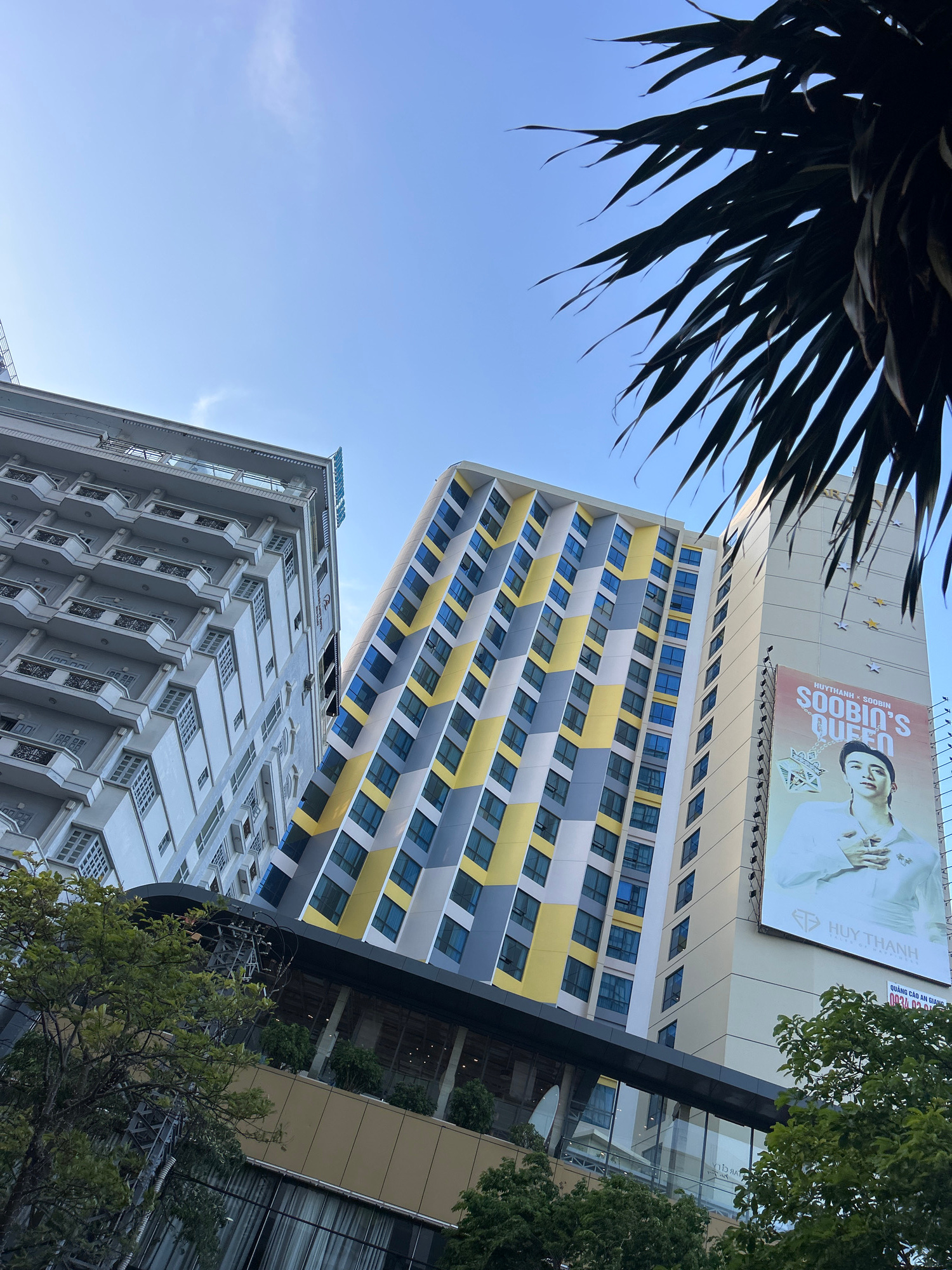 The image shows a low-angle view of several buildings in Nha Trang, Vietnam. The sky is clear and blue. A palm tree's fronds are visible in the upper left corner. The tallest building has a billboard…read more