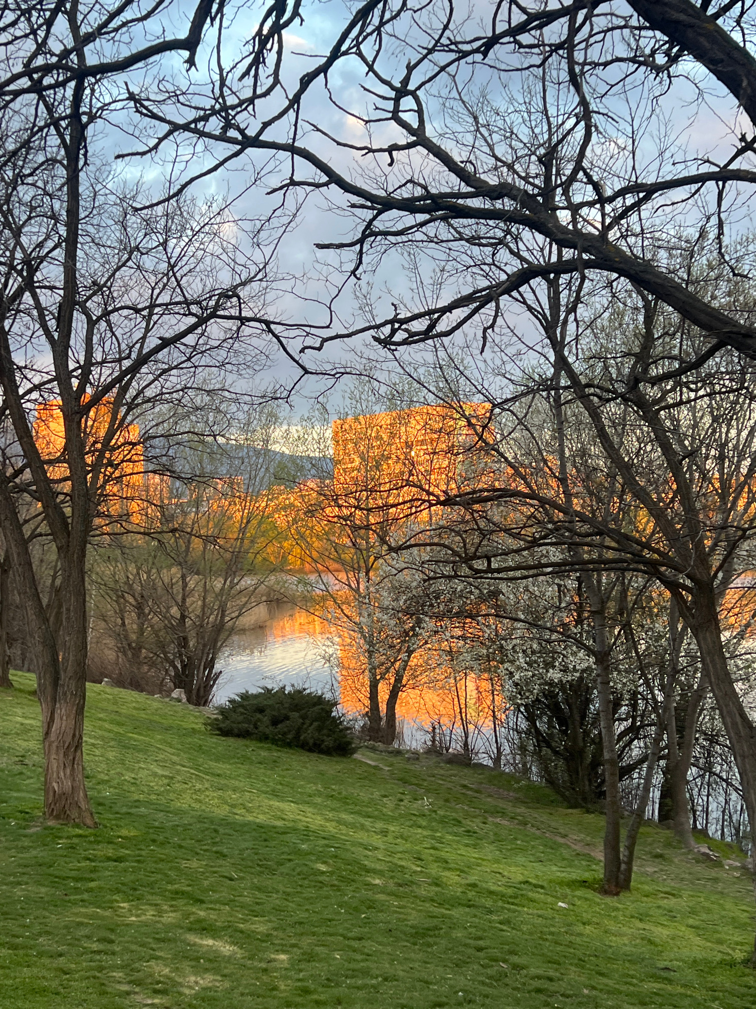 The image depicts a park landscape at dusk or dawn, potentially near a body of water like a river or lake. In the foreground, a lawn slopes upward with trees lining its edge, their bare branches dominβ¦read more