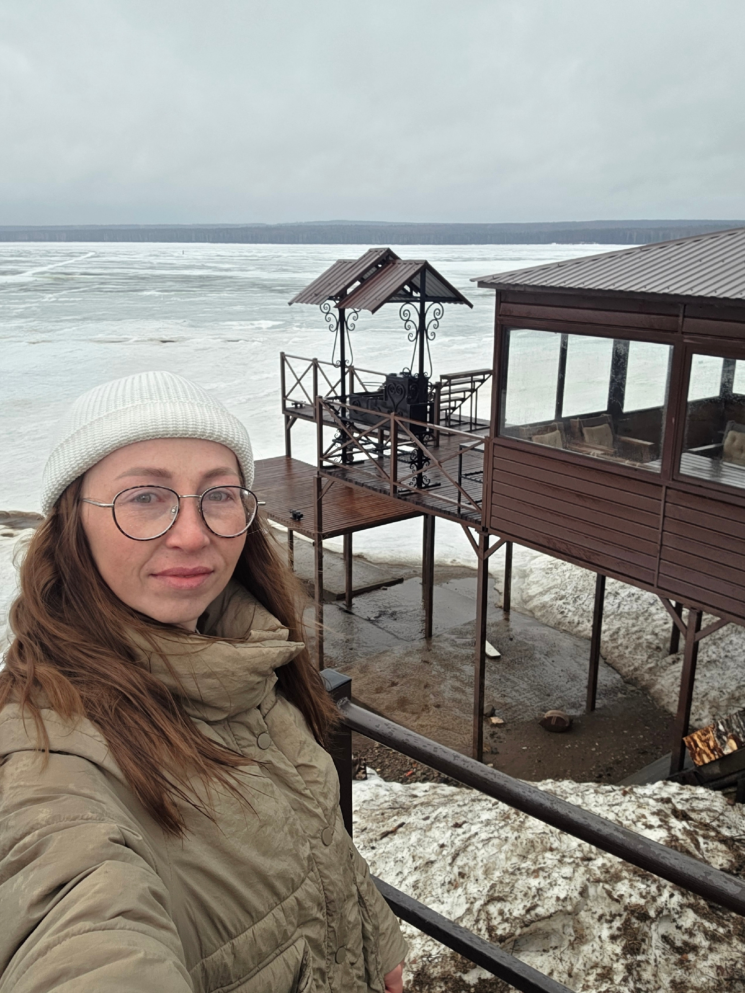 The image shows a selfie of a woman with red hair and glasses wearing a beige jacket and white beanie, taken at a gazebo on the edge of a body of water (likely a river or lake) in Chaikovsky, Russia.…read more