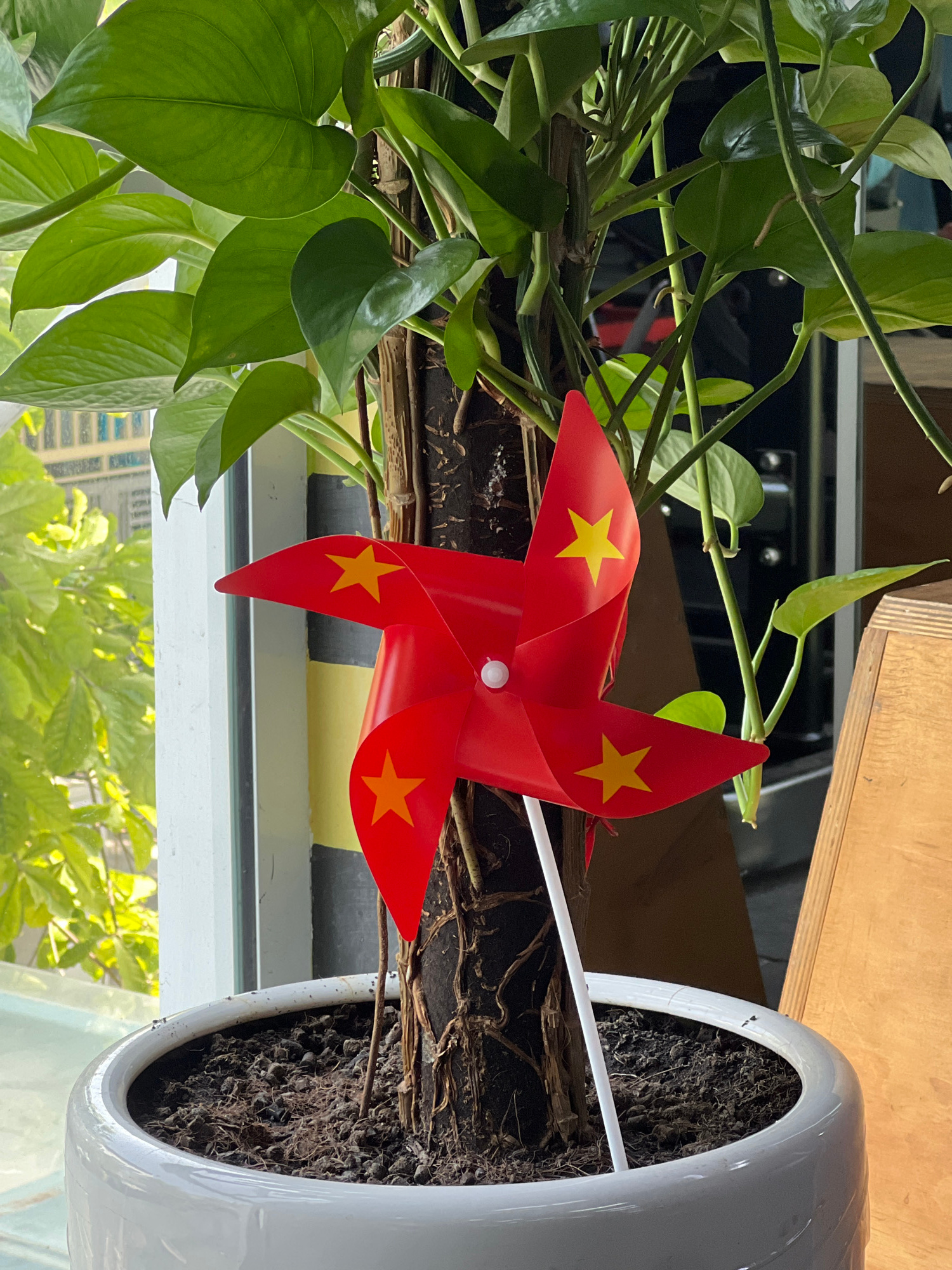This media file captures a close-up, brightly lit indoor scene featuring a lush green plant and a decorative pinwheel. **Subjects:** The primary subjects are a vibrant green leafy plant, likely a Pot…read more
