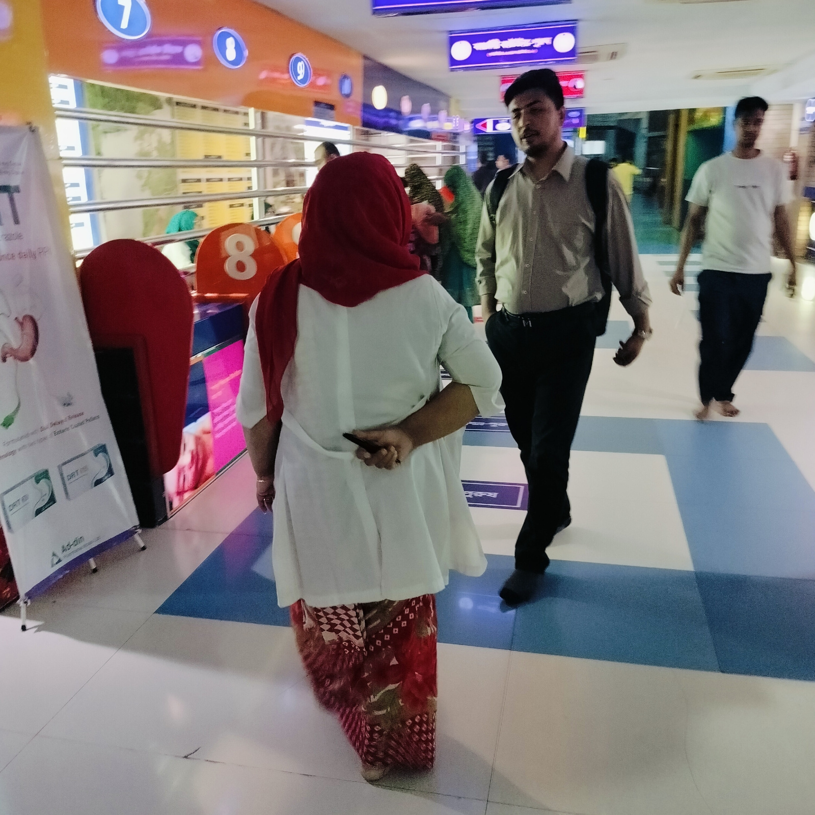 The image was taken in a public indoor space in Dhaka, Bangladesh, possibly a hospital waiting area, as indicated by the numbered seating arrangement with blue numbers (7, 8, 9) and an advertisement sā¦read more