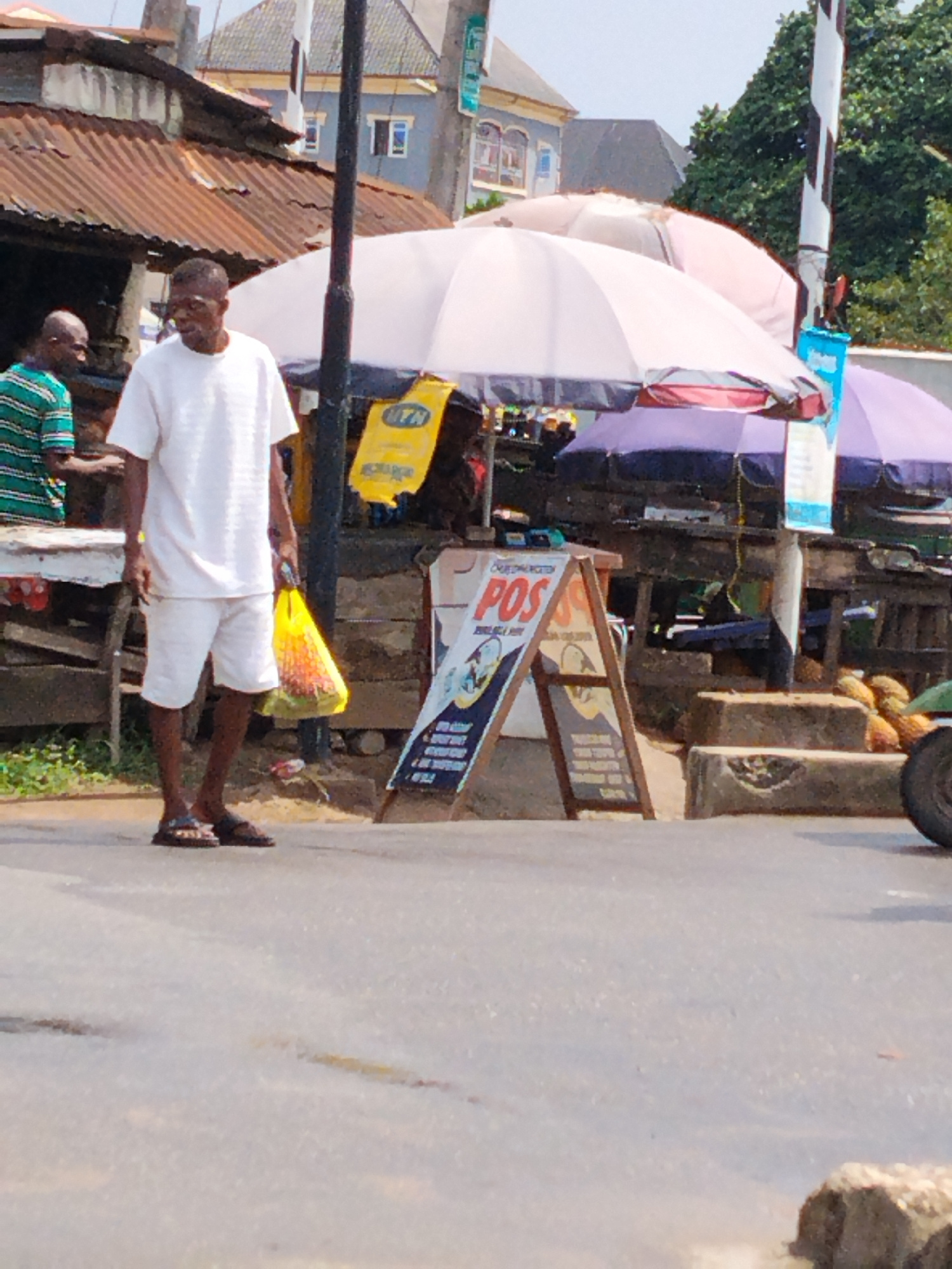 The image depicts a street scene in Aba, Nigeria. A man in a white shirt and shorts walks across the road carrying a yellow plastic bag. To his left, another man wearing a green striped shirt stands i…read more