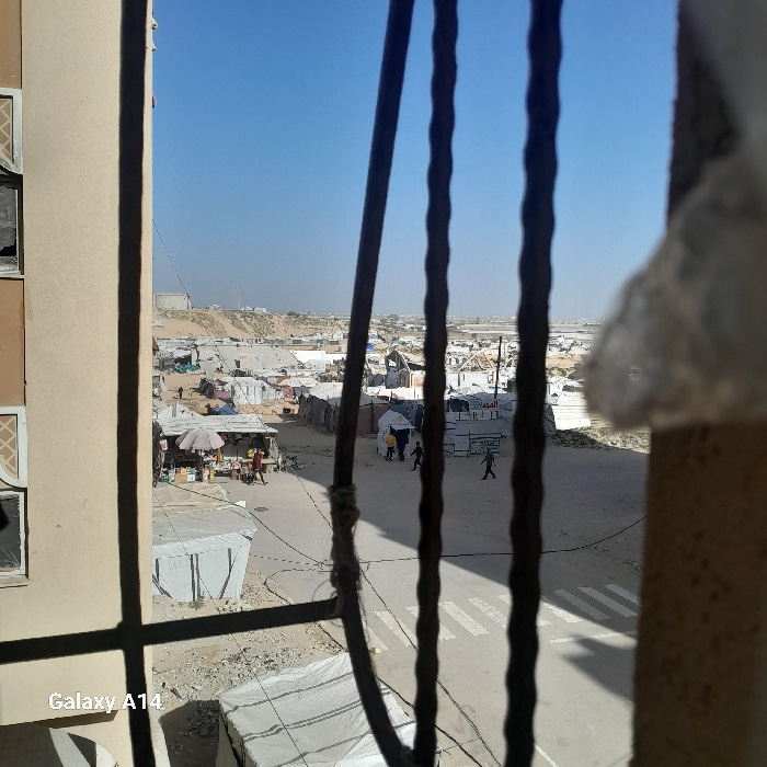 View from a window with metal bars looking out onto a densely packed urban or refugee camp setting. Makeshift structures and tents populate the landscape, with a road running through the middle marked…read more
