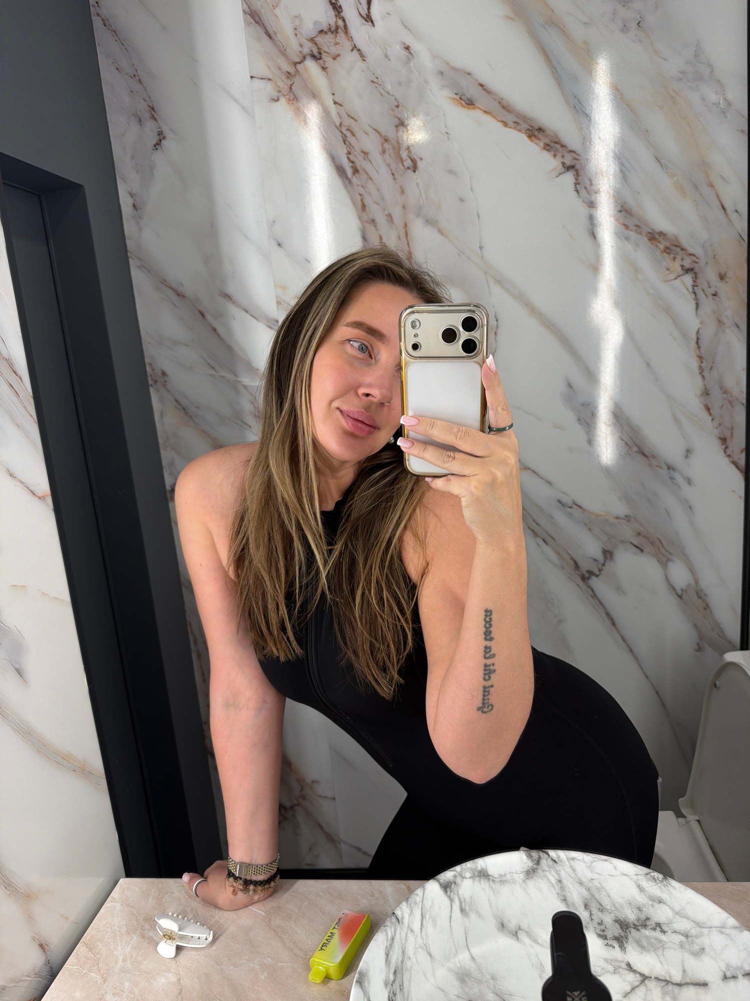 A woman is taking a selfie in a bathroom with marble walls and flooring. She is wearing a black top. Her hair is blonde with dark roots. She is holding a white and gold iPhone. There is a sink and a t…read more