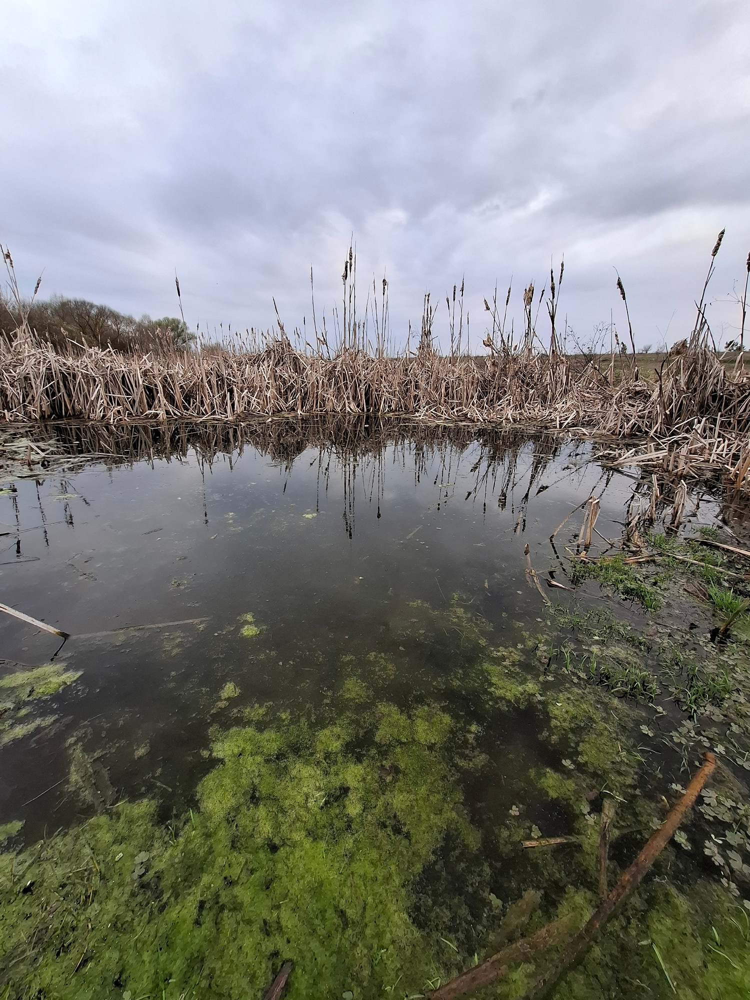 The image depicts a waterlogged area, possibly a marsh or pond, in Khlevnoye, Russia. Dominating the left side are tall, dry reeds or cattails, their stalks and seed heads reaching skyward. Their refl…read more