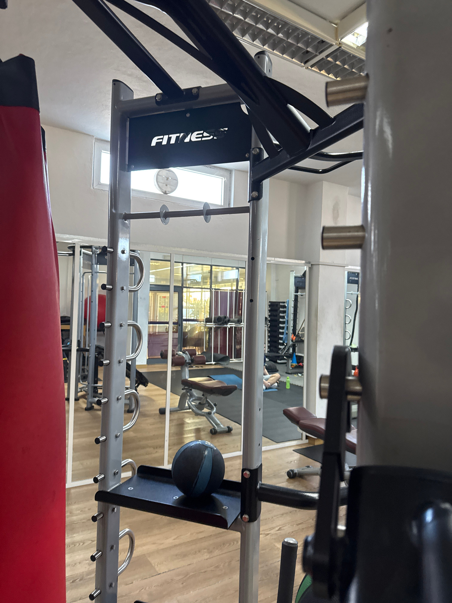 The image shows an indoor gym environment, likely in Mirandela, Portugal based on the geotag. The perspective is from behind gym equipment, specifically a power rack or similar fitness apparatus. Partβ¦read more