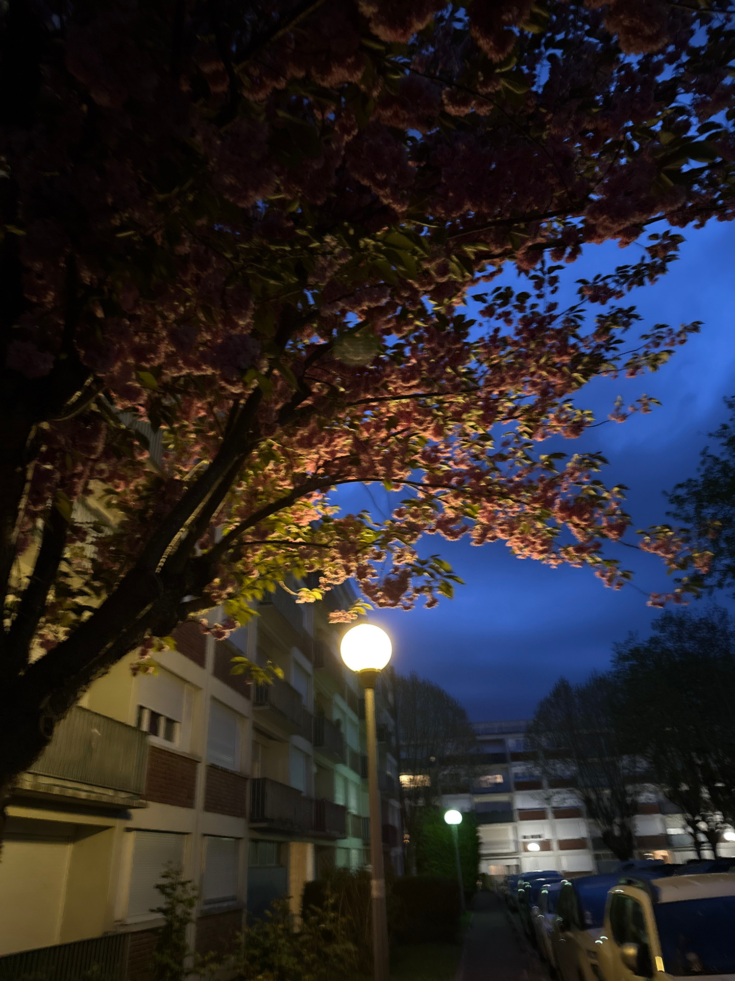 The image depicts a street scene in Domont, France, at night. A flowering tree with pink blossoms is prominently featured in the foreground, its branches extending across the frame. The sky is a deep…read more