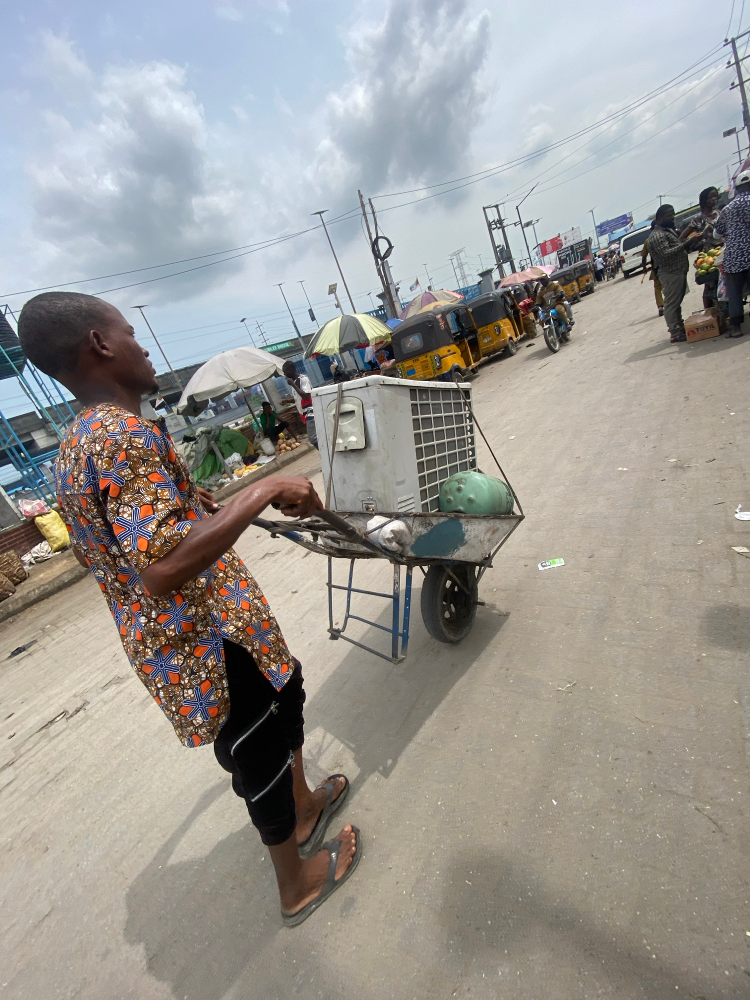 The image captures a lively outdoor street or market scene in Lagos, Nigeria, under an overcast sky. In the foreground, a man of African descent is seen pushing or guiding a two-wheeled handcart. He w…read more