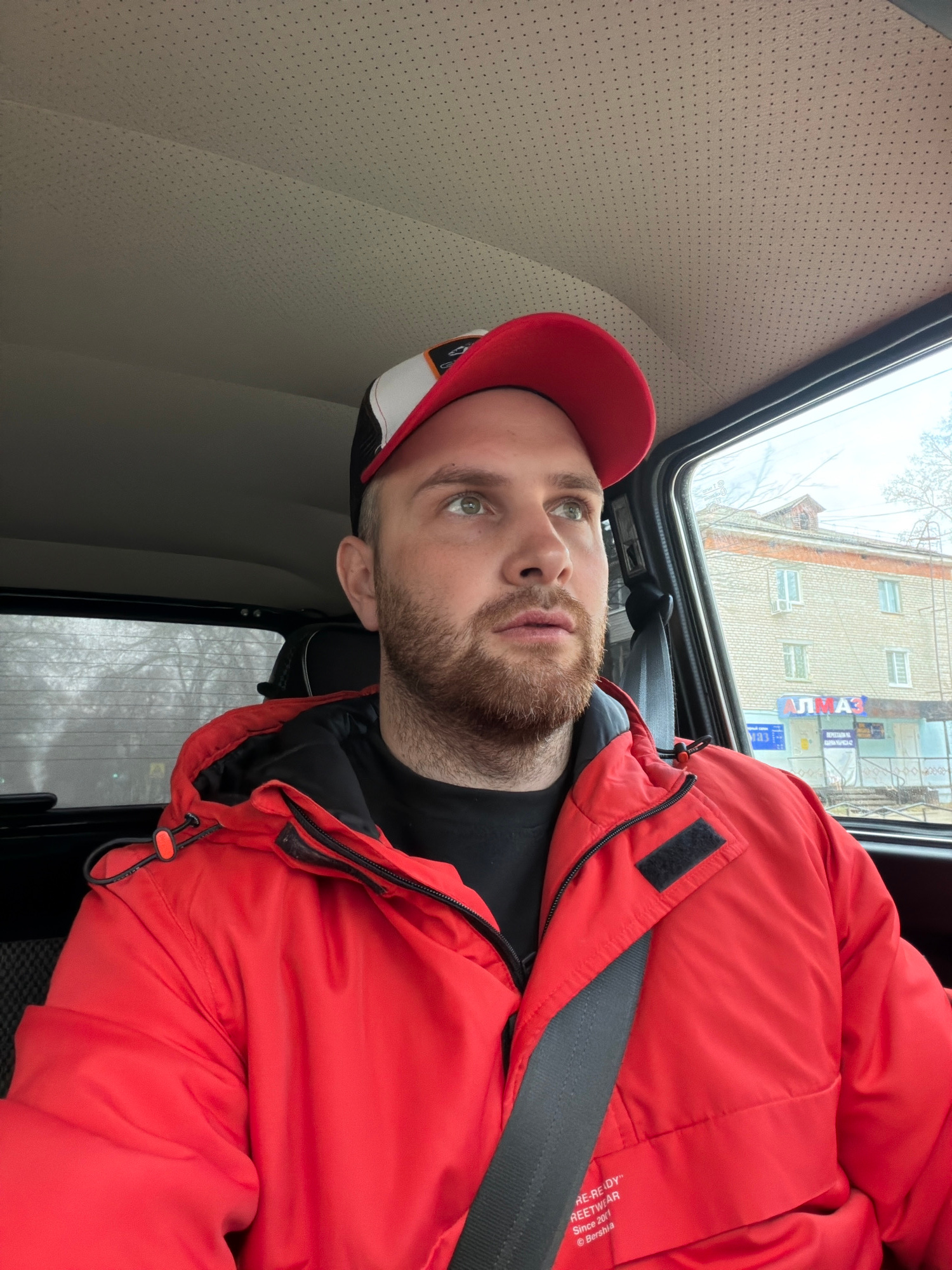A man with a beard and a red baseball cap is depicted in a portrait-style shot, taken inside a vehicle, likely in Chaikovsky, Russia. He is wearing a bright red, possibly padded, jacket over a black t…read more