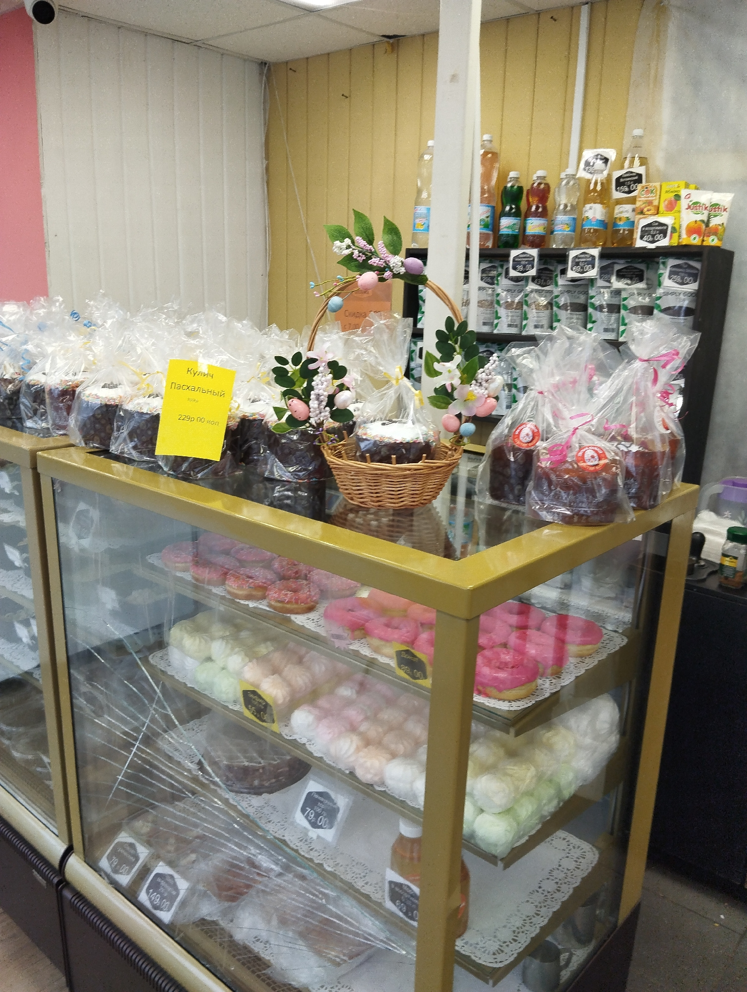 The image depicts a retail setting, likely a bakery or grocery store, in what is possibly Votkinsk, Russia, based on the Cyrillic text visible. A glass display case dominates the foreground, showcasin…read more