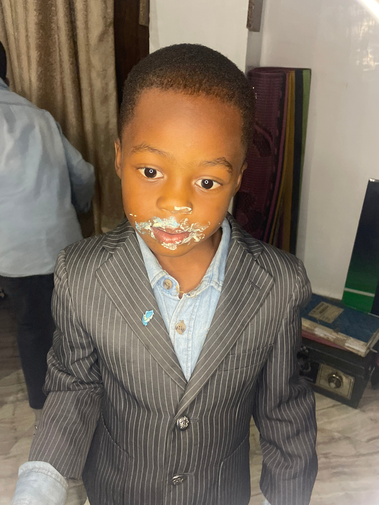 A young child with dark skin and short hair is wearing a pinstripe suit over a light blue denim shirt. He has frosting around his mouth, indicating he may have been eating cake. The background include…read more