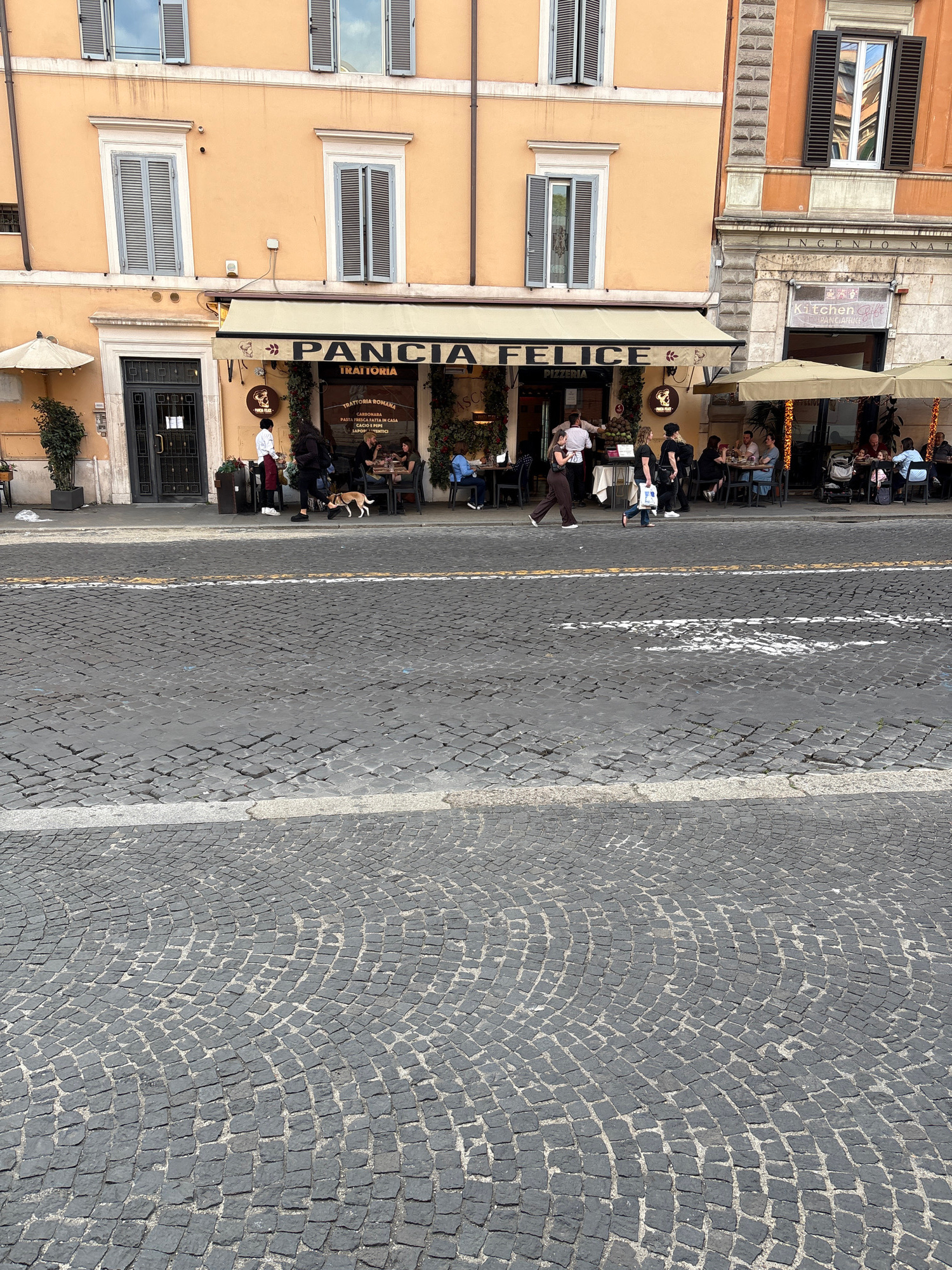This is an outdoor scene in Rome, Italy. The main focus is on "Pancia Felice", an Italian restaurant with outdoor seating along a cobblestone street. People are seated at tables under an awning, some…read more
