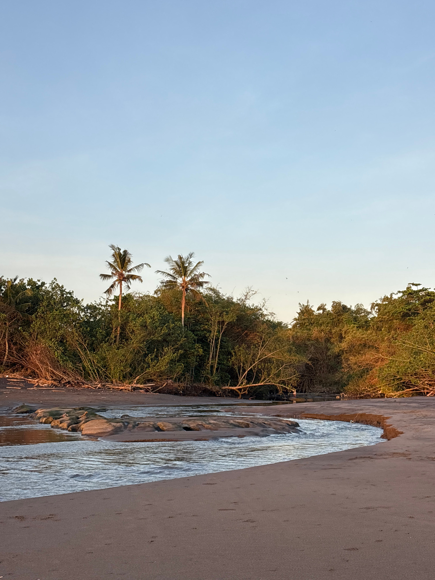 The photograph shows a beach scene in Kerambitan, Indonesia. A stream of water runs vertically between a dark sand beach and dense vegetation, including palm trees. The sky is light blue.