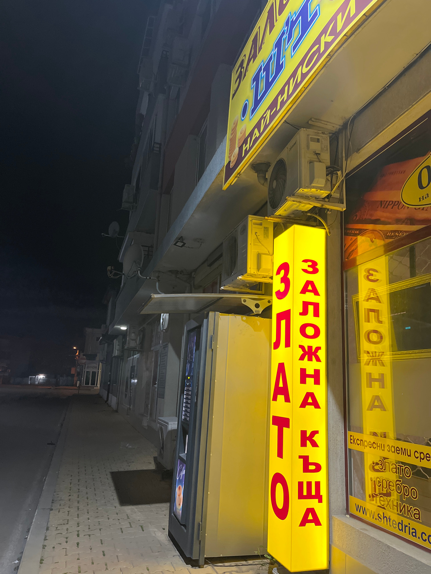 The image shows a nighttime street scene in Nova Zagora, Bulgaria, with illuminated signage in Cyrillic. The signs advertise "Заложна къща Злато," which translates to "Pawnshop Gold," along with infor…read more