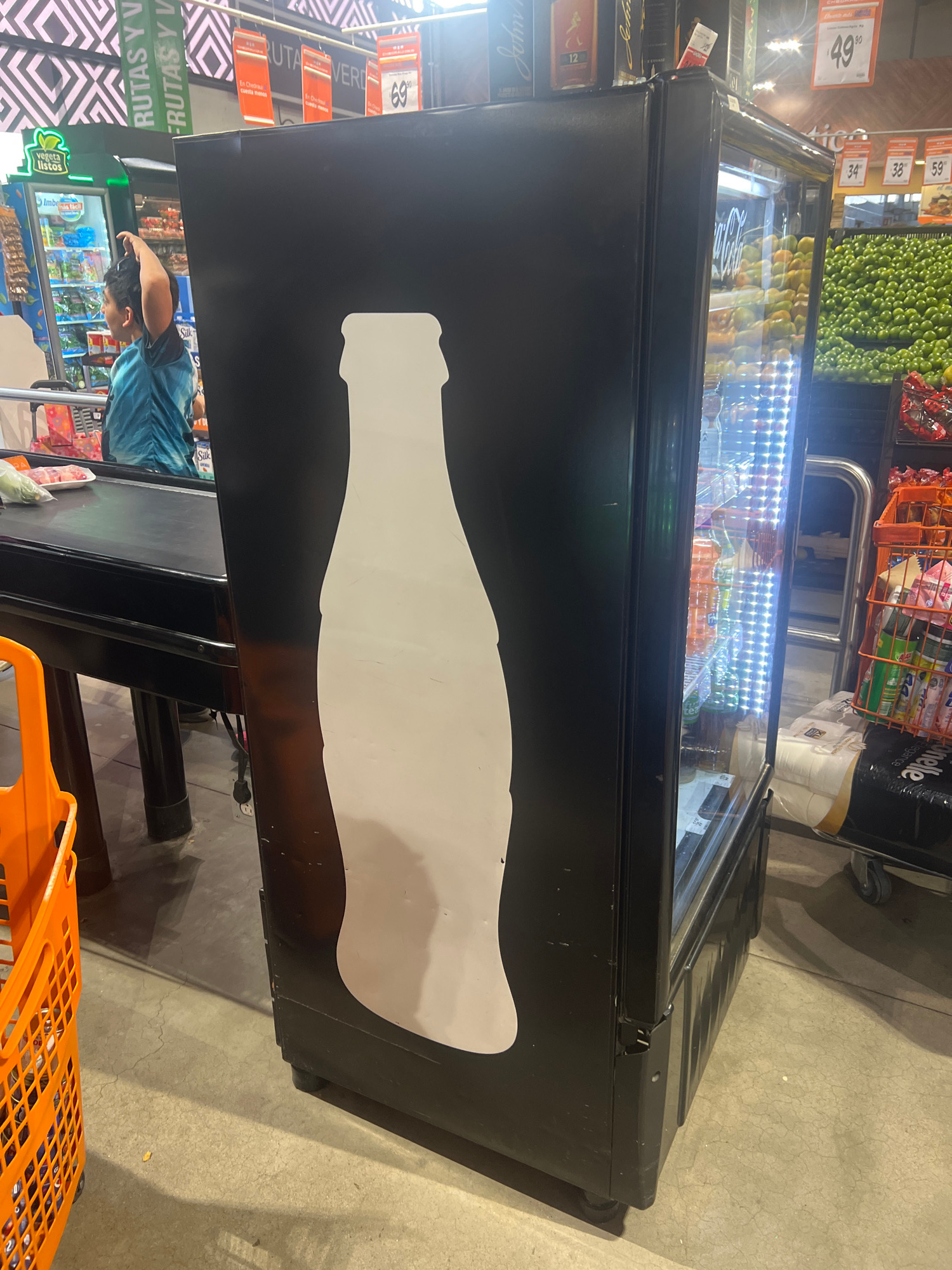 The image shows a black refrigerated display case with a white silhouette of a Coca-Cola bottle on its side. The case is in what appears to be a supermarket checkout lane. There are items visible insi…read more
