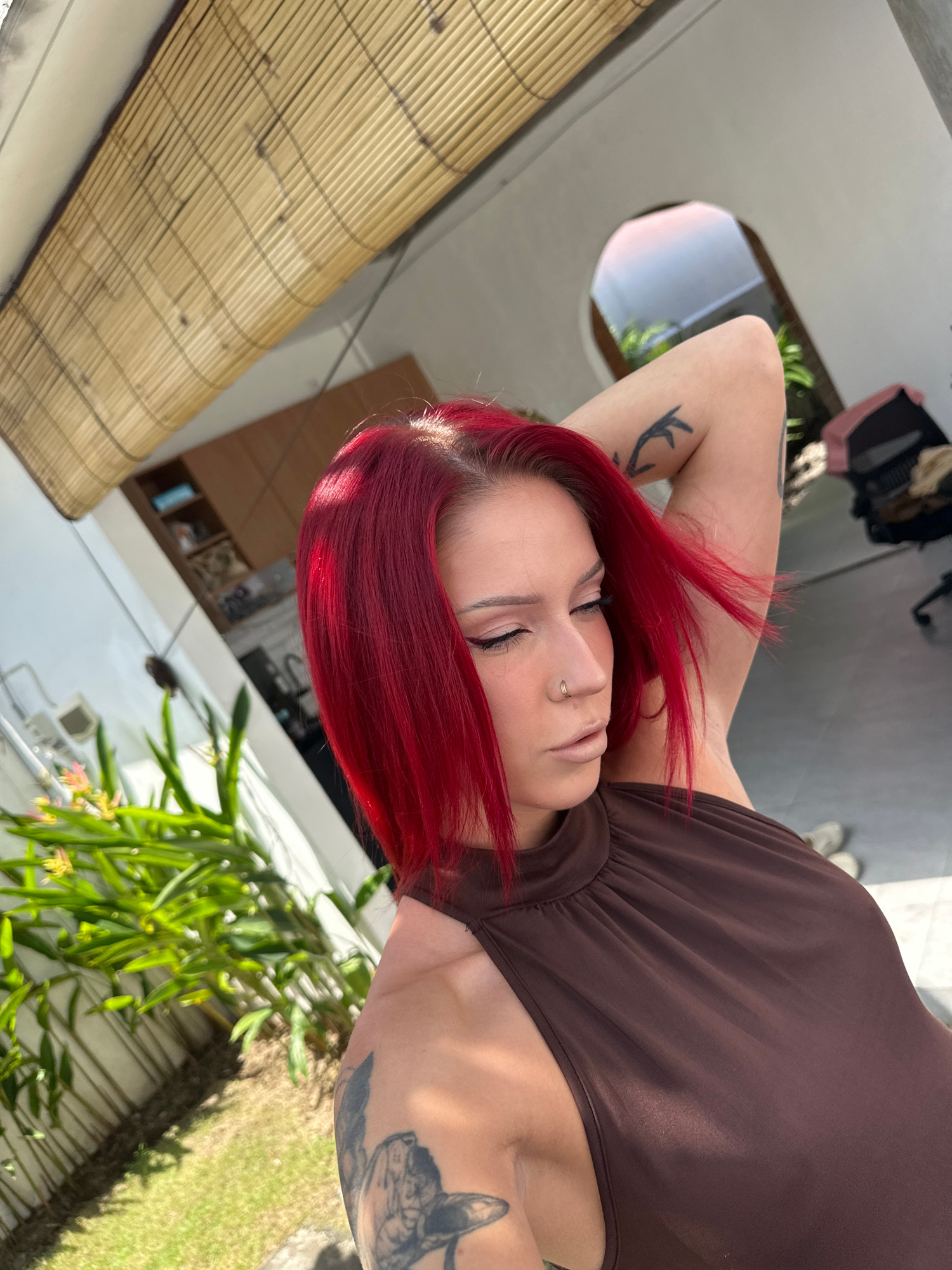 A woman with vibrant red hair lies supine, eyes closed, wearing a brown halter-style top. A small gold hoop adorns her nostril. Tattoos are visible on her arms, one a stylized antler design, the other…read more