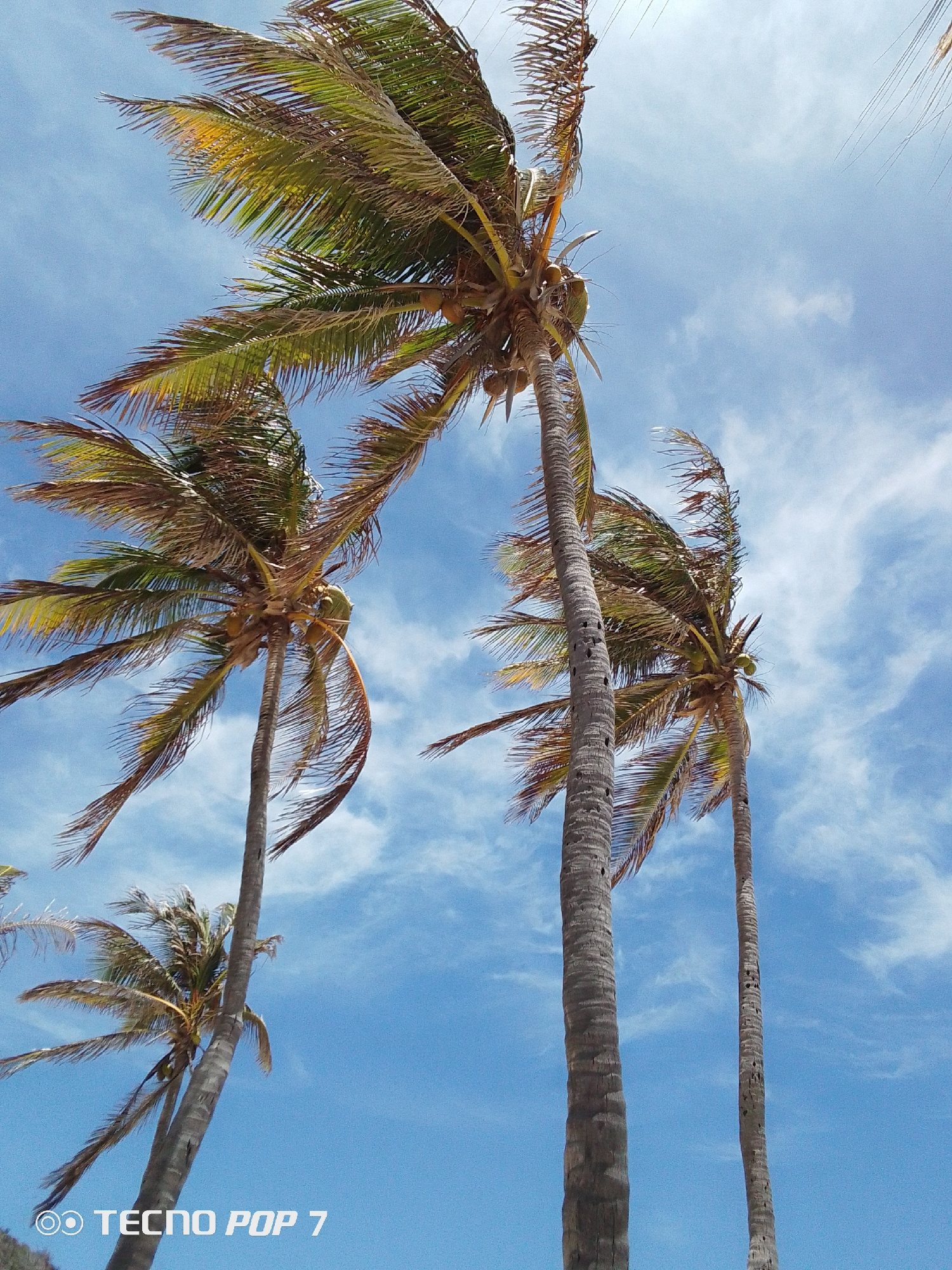 The image shows a low-angle view of several tall palm trees against a blue sky with scattered white clouds. The leaves of the palm trees are blowing in the wind. The palm trees are presumably located…read more