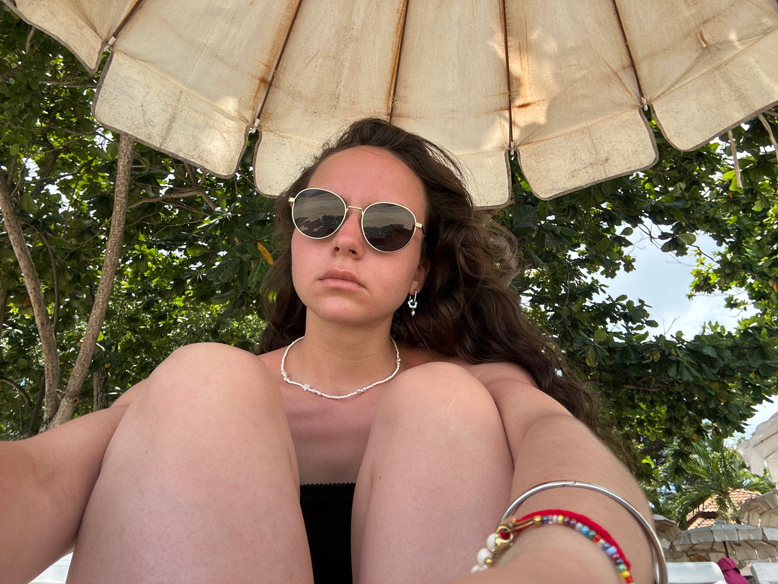 From a low-angle perspective, a woman in black swimwear poses under a parasol on a beach in Ao Hin Khok, Thailand. She wears round sunglasses, a beaded necklace, and bracelets on her left wrist. Her b…read more