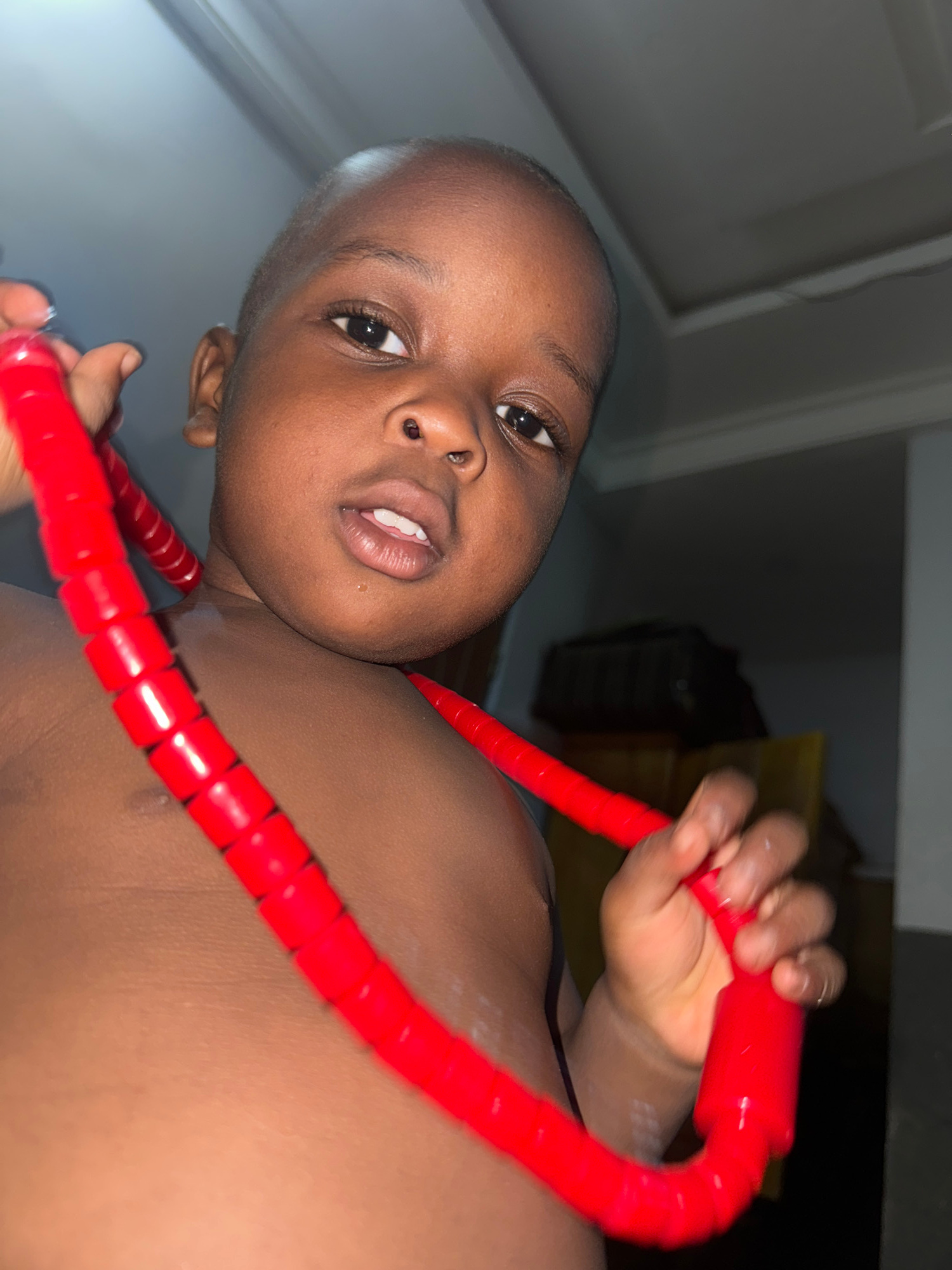 A close-up, slightly angled photograph shows a young Black child, likely between 2 and 4 years old, holding a bright red, segmented plastic tube. The tube is shaped in a semi-circle, extending from the child's right shoulder, across the chest and neck, and down to their left side, where it is held in their left hand. The child's head is positioned to the left, with their face looking towards the camera. The background appears to be an interior space, with a white wall visible in the upper left corner and some dark, undefined shapes and a yellow object suggesting furniture or storage behind the child. No indication of Sabon Tasha, Nigeria, is visible. | Open Wire