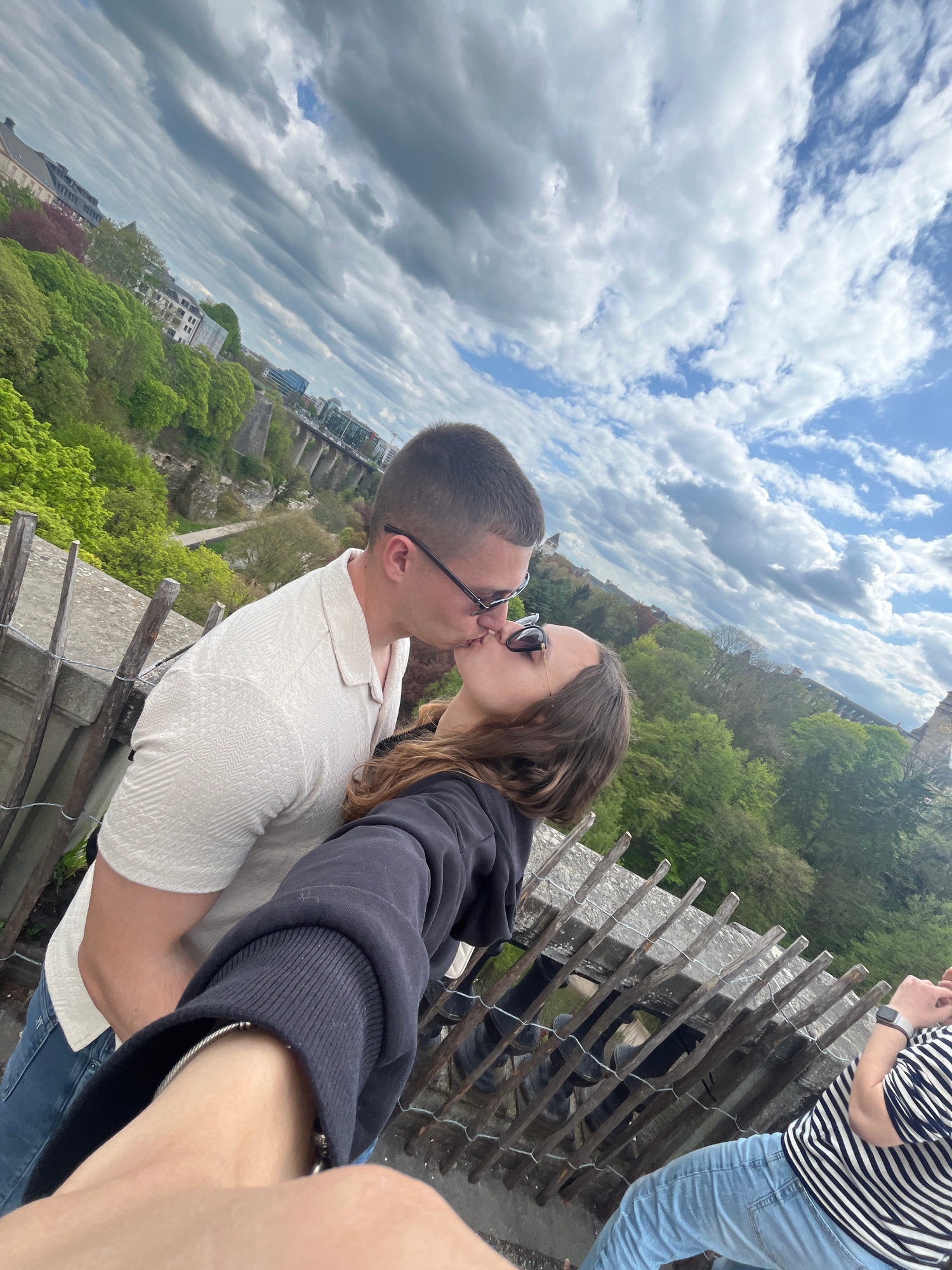 A slightly tilted, high-angle outdoor shot captures a couple kissing, seemingly on a bridge or elevated walkway in Luxembourg. The couple is central, with the man wearing a white collared shirt, glass…read more