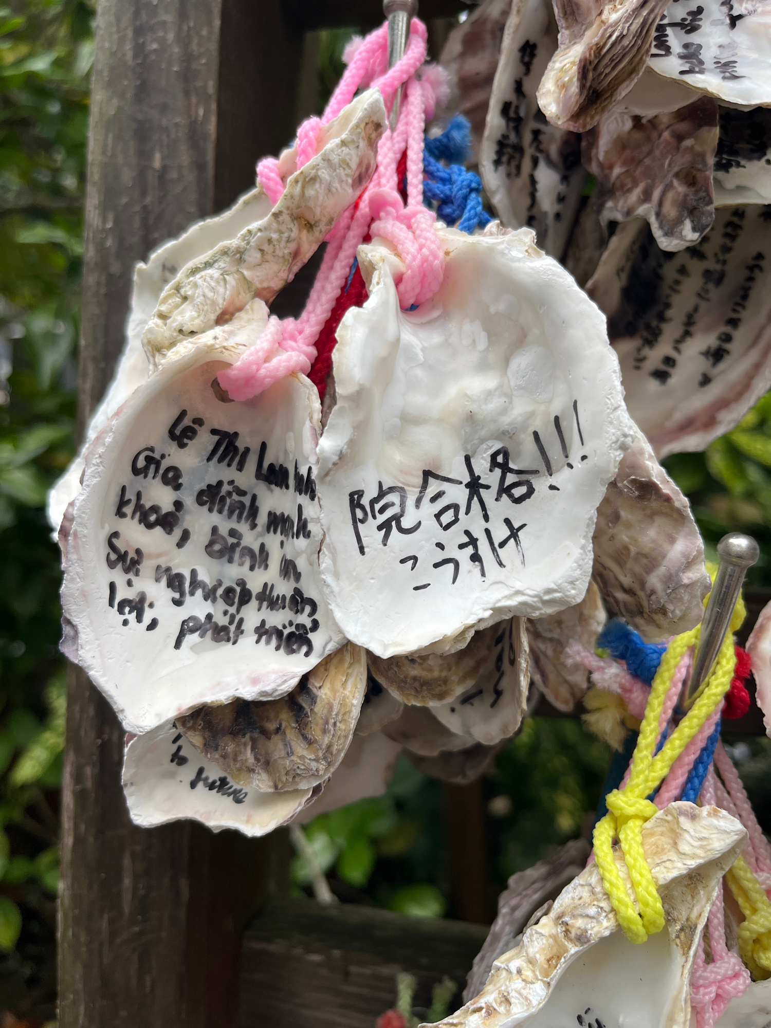 The image shows a collection of oyster shells hanging together, likely at a shrine or temple. The shells are inscribed with wishes or prayers in both Japanese and Vietnamese. A shell with Japanese wri…read more