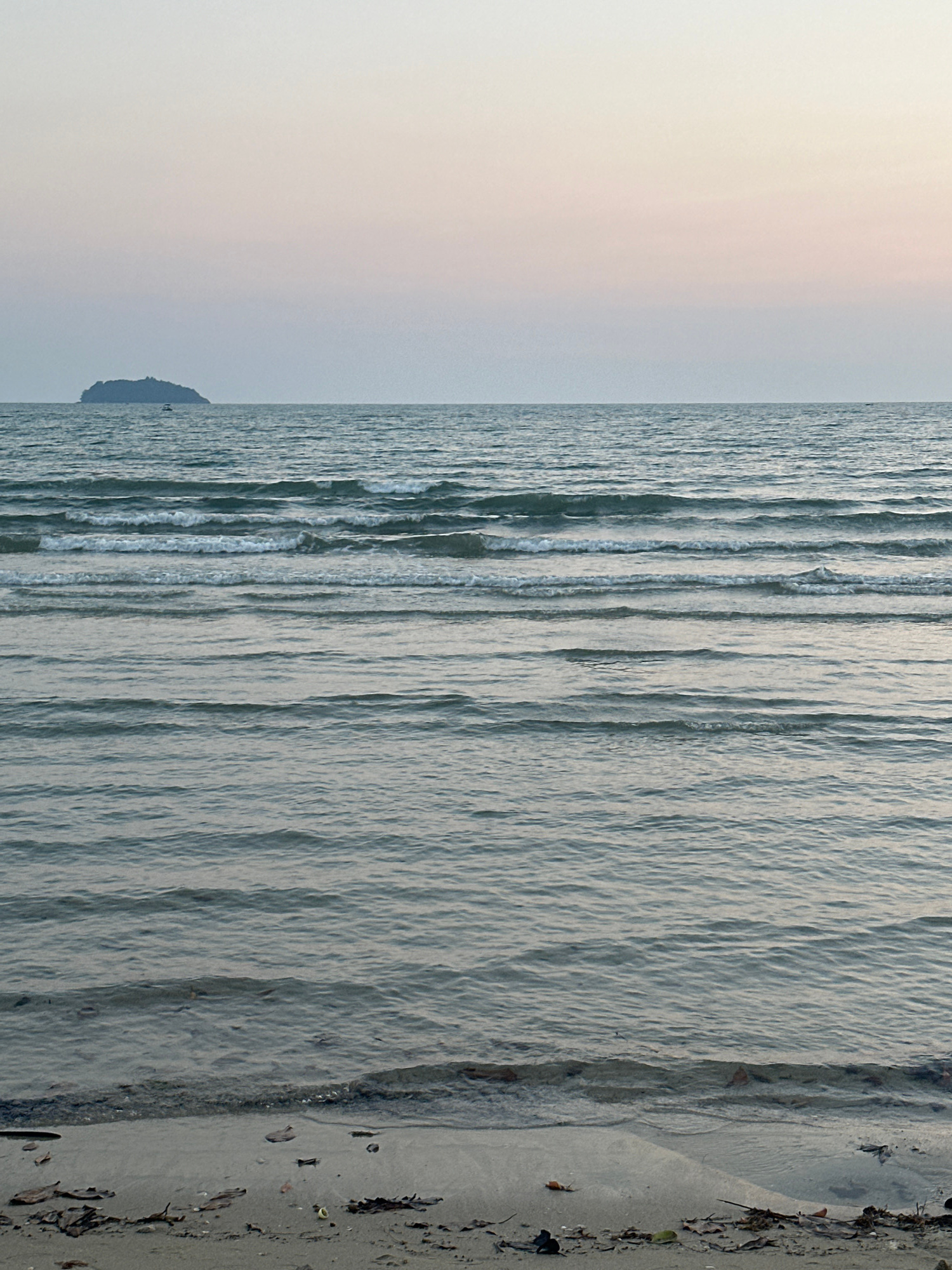The image shows a view of the ocean and beach in Baan Klong Prao, Thailand. The beach is on the right side, transitioning to the ocean on the left. Gentle waves are visible throughout the water. The s…read more