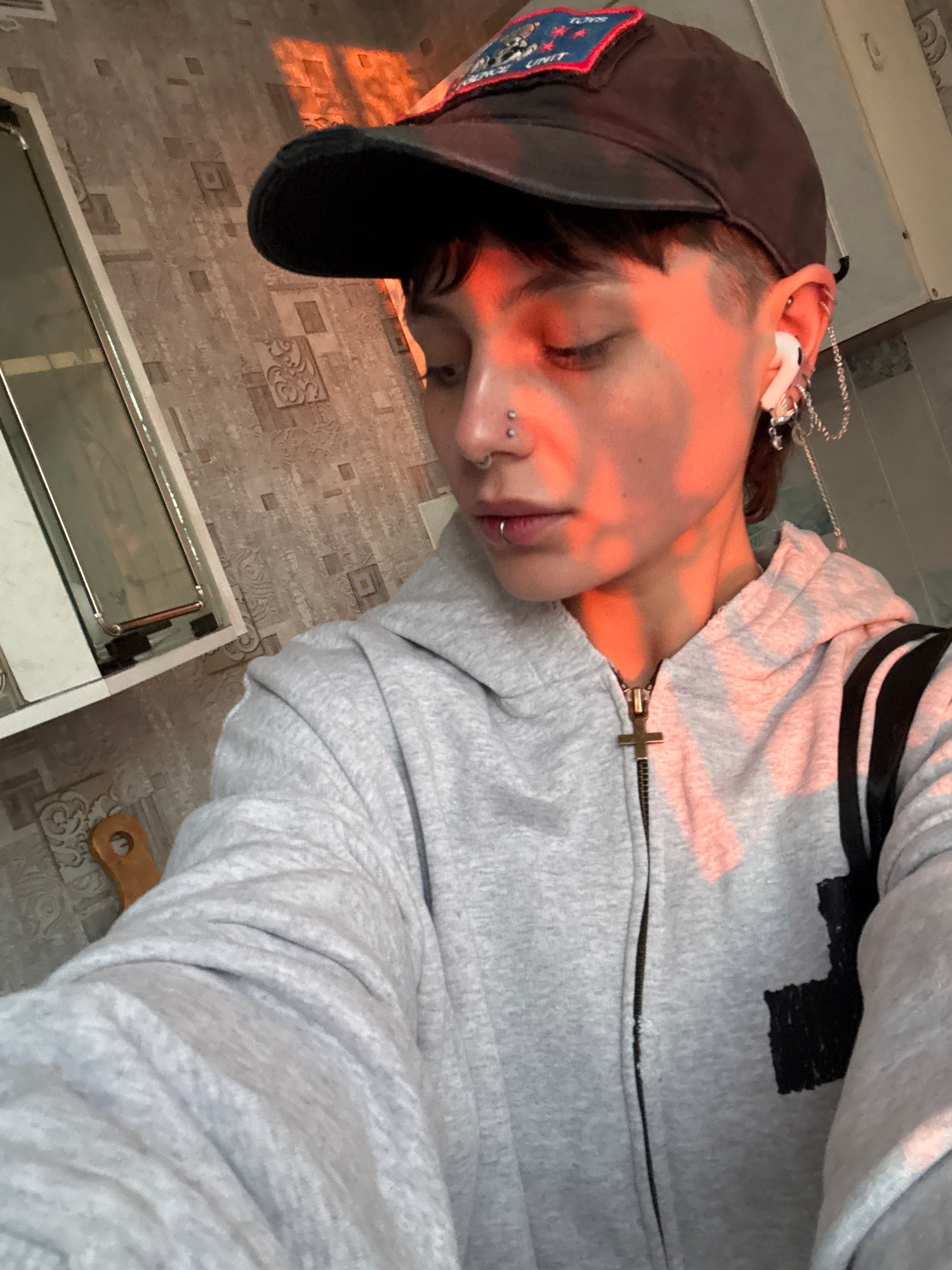 A person wearing a gray sweatshirt with black stripes and a black baseball cap is depicted in a close-up, eye-level shot. The person's face is illuminated by warm, orange-toned light, possibly sunligh…read more