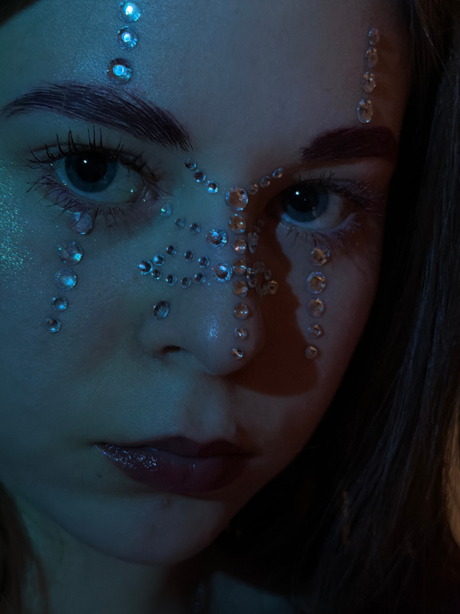 A close-up, medium shot features a person's face, decorated with small, reflective rhinestones. The rhinestones are arranged in patterns along the brow bone, under the eyes, and across the nose. The p…read more