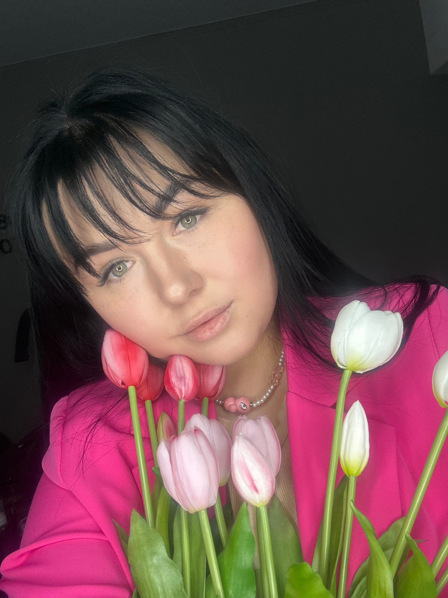 A rotated, high-angle close-up captures a woman with long, dark hair partially obscuring her face. She has light skin and appears to be wearing makeup. A string of pink and white beads adorns her neck…read more