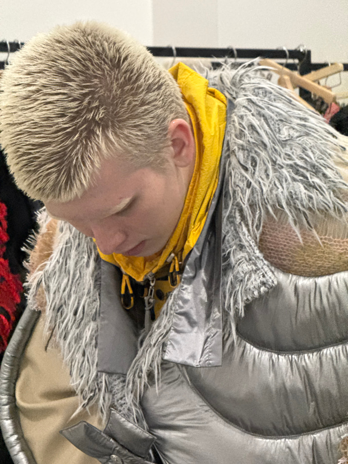 A young person with short, bleached blonde hair is depicted in a close-up, looking downwards. The scene takes place indoors, likely within a fashion-related establishment such as a showroom or boutiqu…read more
