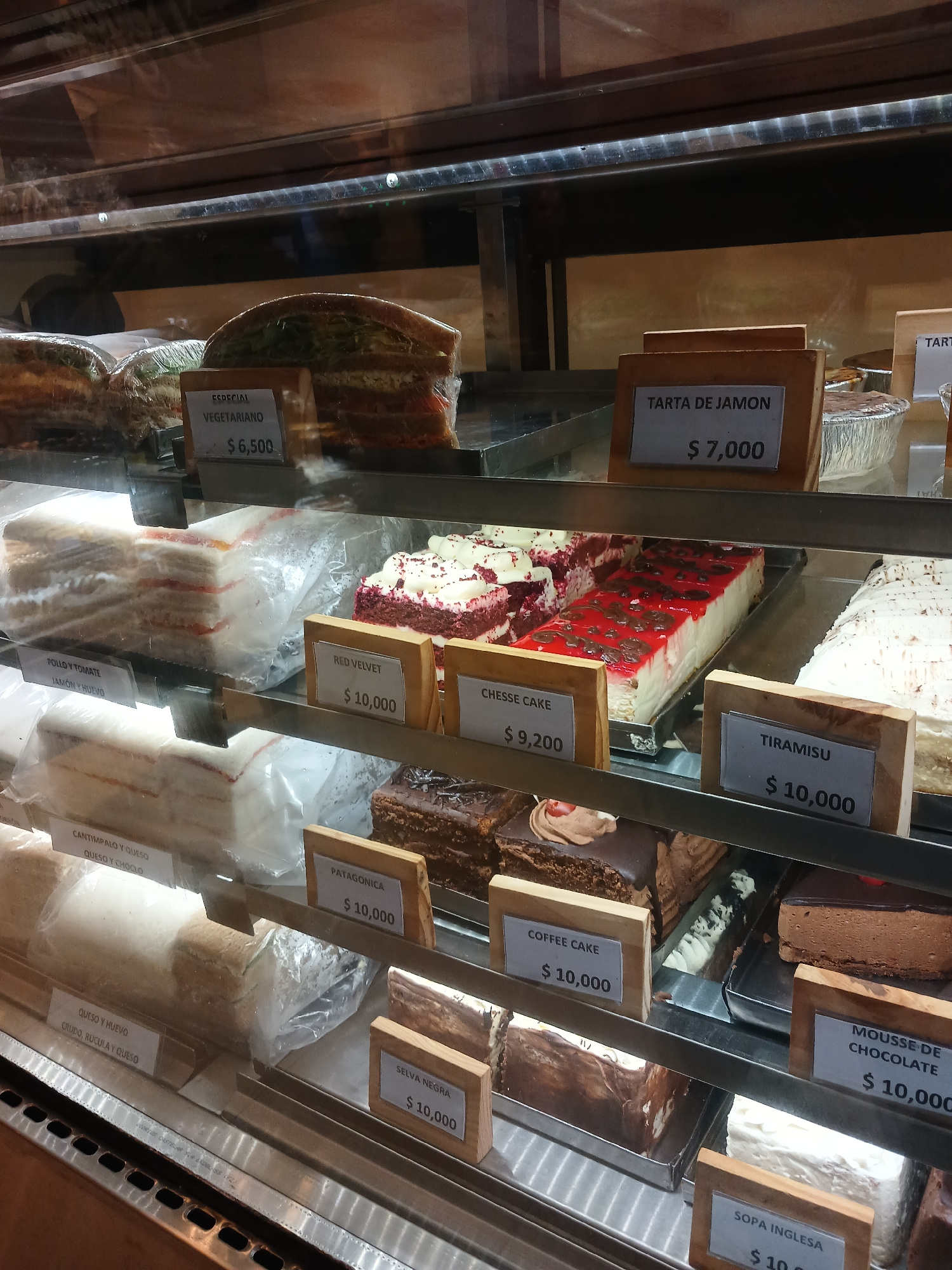 A refrigerated display case contains slices of various cakes and pastries. Each slice is labeled with a wooden tag displaying the type of cake and the price, denoted in pesos. The selections include "…read more