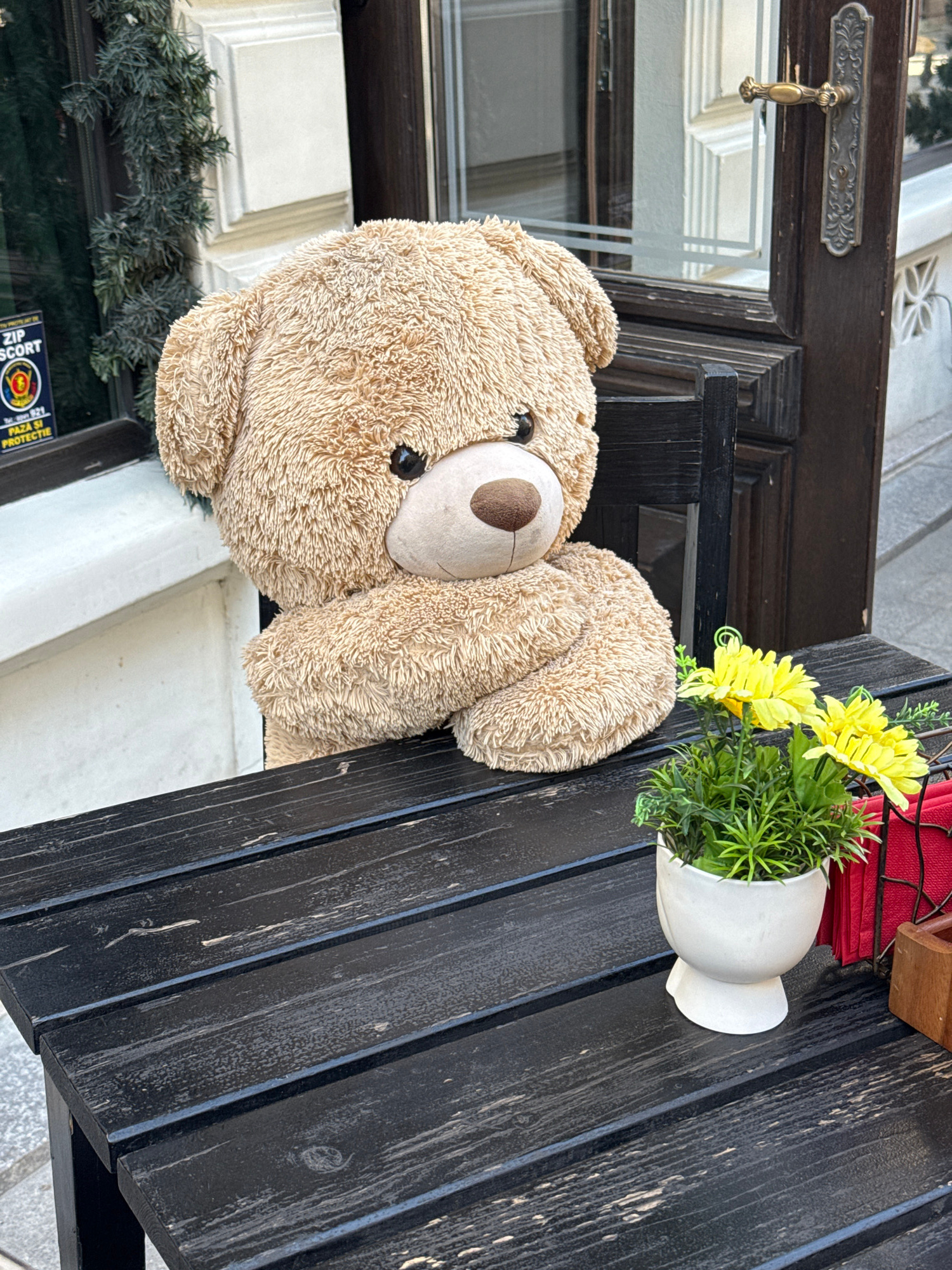 A teddy bear rests on a black wooden table alongside a white vase containing yellow flowers and greenery. The table is situated near the entrance of a building with a glass door, on which a sticker is…read more