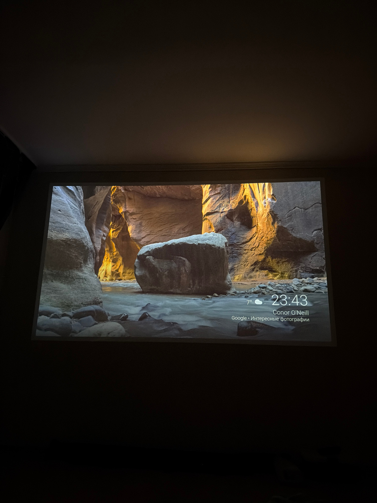 The image shows a large vertical screen displaying a landscape photograph. The photograph is a cave or gorge scene with light illuminating the rock formations. A waterfall-like feature is on the right…read more
