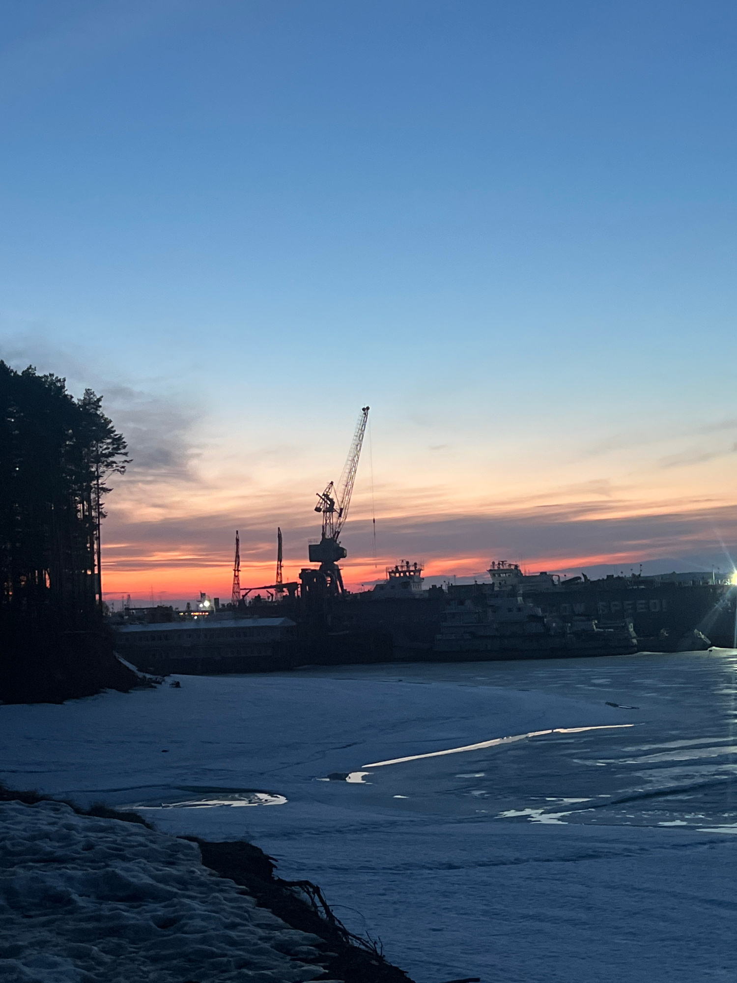 The image is a horizontally oriented, slightly low-angle shot of a twilight scene in what is likely the city of Chaikovsky, Russia. A sky gradient transitions from blue in the upper left to peach/oran…read more