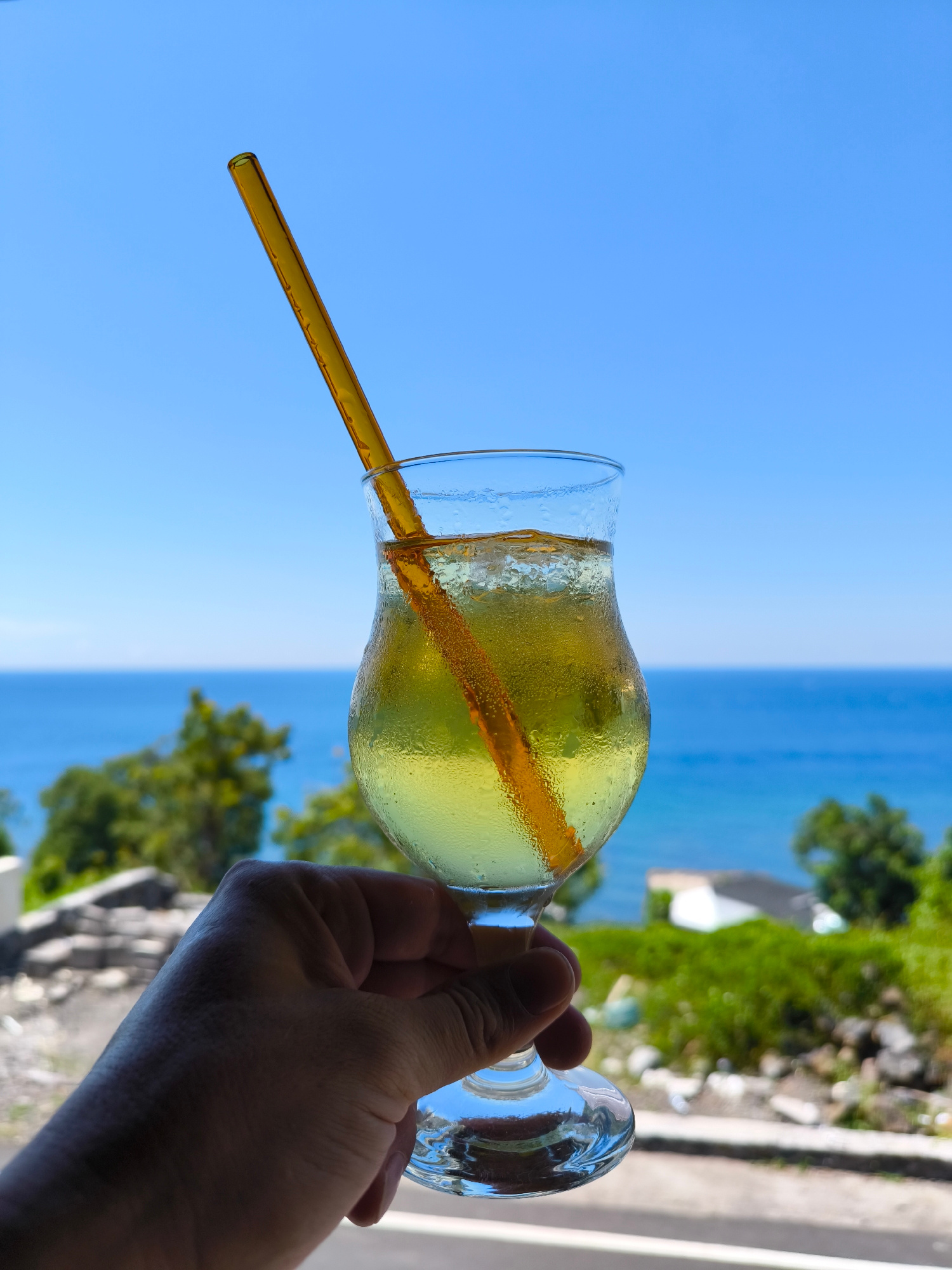 A hand holds a glass of yellow liquid with an amber straw against a backdrop of a clear blue sky, ocean, and green vegetation. The glass is sweating, indicating it is cold. The location is Unknown, In…read more