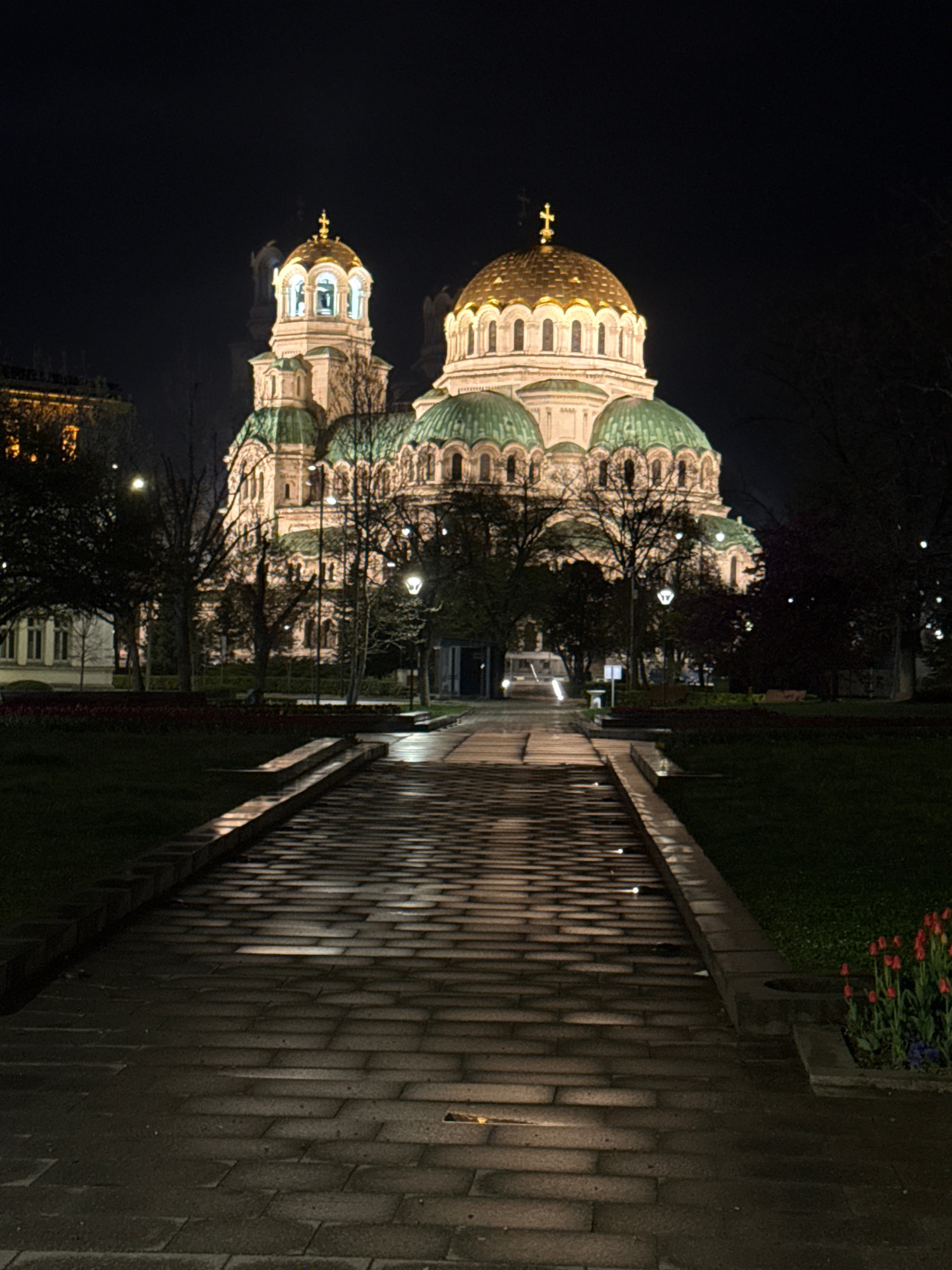 The image shows the Alexander Nevsky Cathedral in Sofia, Bulgaria at night. The cathedral is illuminated, highlighting its golden domes and architectural details. A paved pathway with light fixtures r…read more