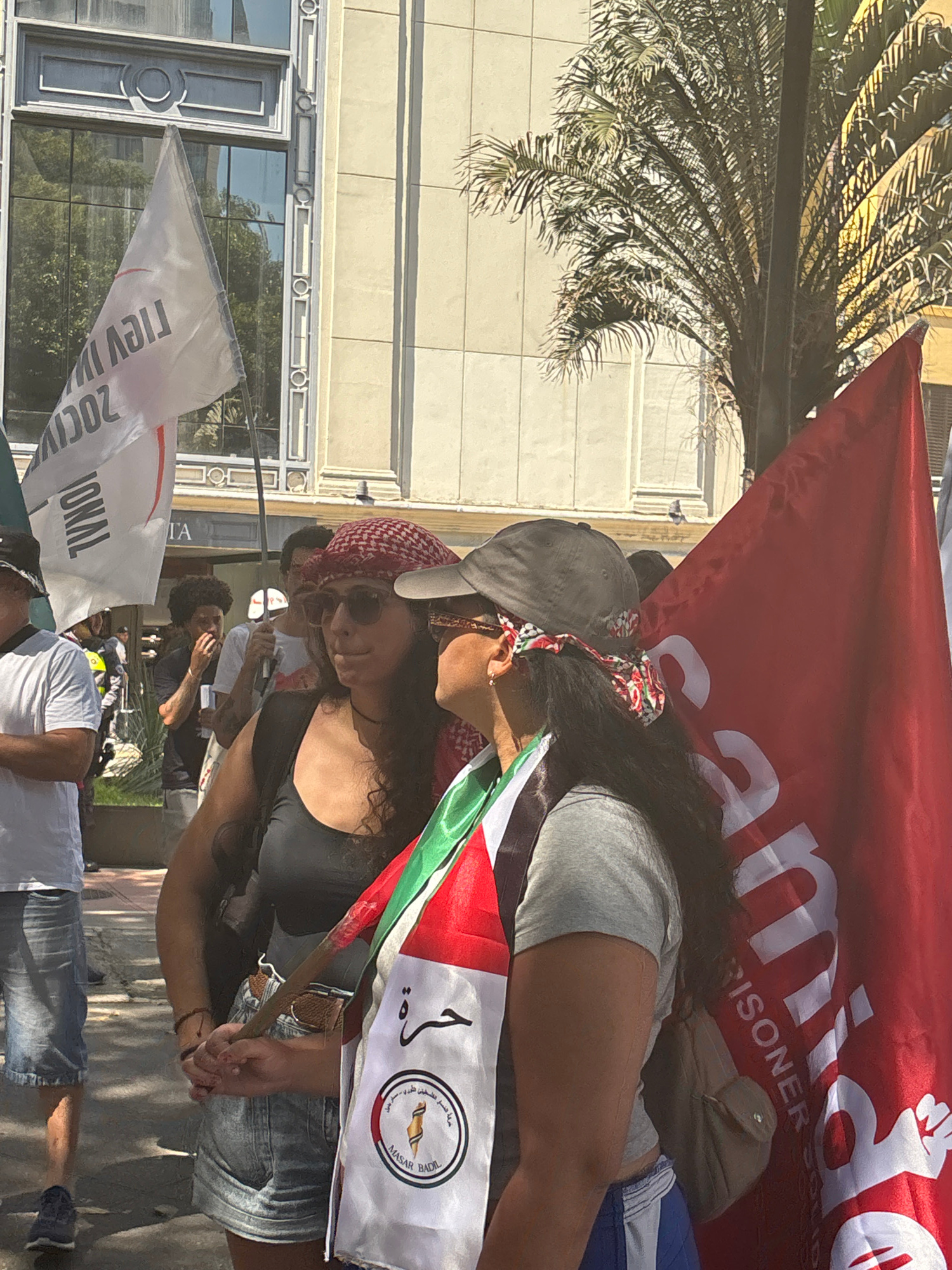 The image captures a protest in São Paulo, Brazil. A group of people is gathered, holding flags. One flag is red with the word "Samidoun" and a clenched fist symbol. Another flag is white with green a…read more