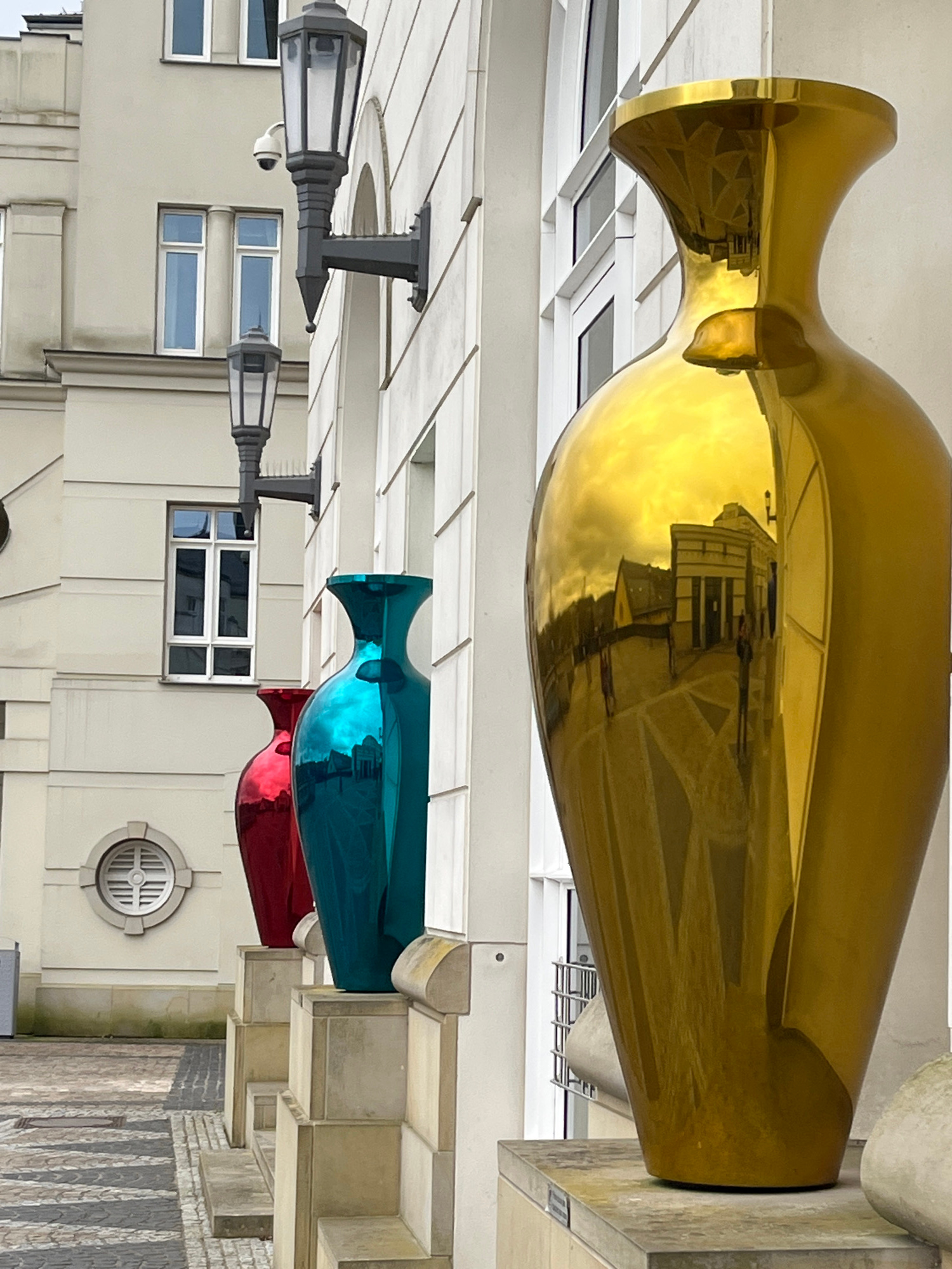 The image depicts a street in Luxembourg City, Luxembourg, specifically showcasing an art installation featuring large, reflective, vase-shaped sculptures mounted on a building facade. The sculptures…read more