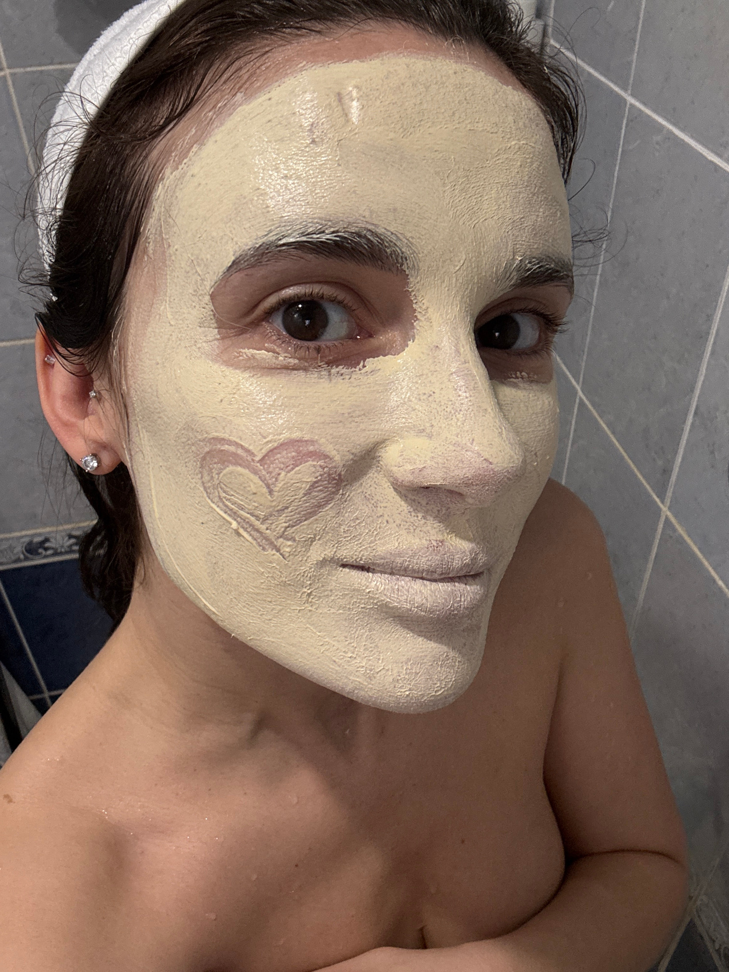 A low-angle shot depicts a woman with a face mask applied in a tiled bathroom, possibly in the city of Chaikovsky, Russia, due to the prompt's instruction. The woman's face is covered in a light-yello…read more